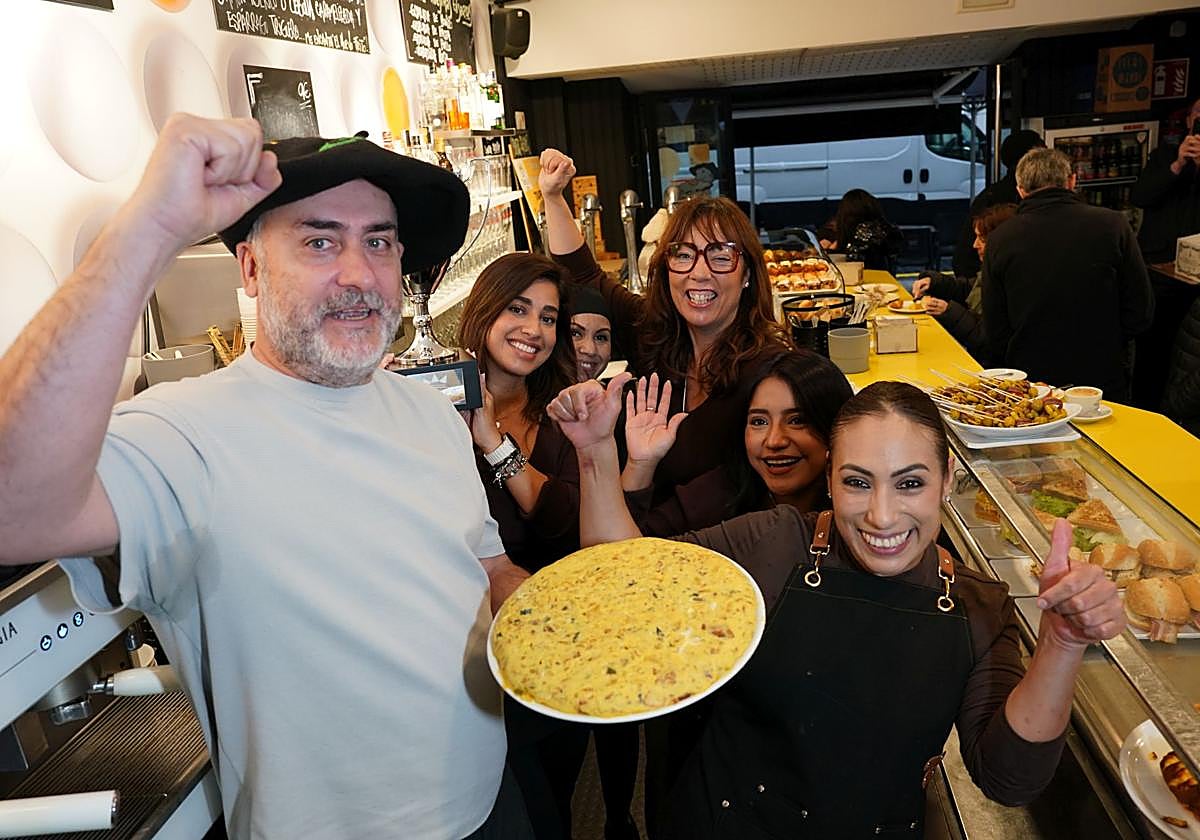Estuvieron a punto de no presentarse al concurso. «Teníamos problemas con la remesa de patatas, pero las chicas de la cocina estaban muy ilusionadas y nos convencieron», relata José. «A la final fuimos sin grandes pretensiones. Empecé a ponerme nerviosa cuando vi cómo hacía Patricia las tortillas, con menos problemas que los demás», añade Susana. La ecuatoriana Patricia Ríos es una de los cuatro cocineros del local (junto a Zenia, Alejandra y Moha) y está en plena acción, cascando doce huevos para que continúe la cadena con un nuevo sol sobre la barra. «Le ponemos mucha intensidad a la hora de hacer la patatita. Al principio, más de una vez se nos quemó, pero yo diría que llevamos ya tres años con nuestra tortilla clásica. La de la final no fue la mejor que hemos hecho, porque estamos acostumbrados al gas y allí era inducción». Todos los días sacan entre quince y veinte, que pueden llegar a treinta los fines de semana, y preparan seis variedades diferentes, entre las que destaca la de calabacín y pimiento verde.