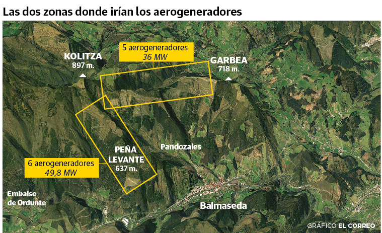 Dos parques eólicos a instalar entre los montes Kolitza, Peña Levante y La Garbea, con once aerogeneradores en total, ocupando estas conocidas cimas de Las ... Encartaciones, dentro de los términos municipales de Balmaseda y Arcentales. Es el proyecto que una empresa domiciliada en Alicante pero íntimamente relacionada con un gran grupo danés de energías renovables quiere llevar a cabo en la comarca. La iniciativa ha comenzado este verano a cumplir sus primeros pasos en los despachos.