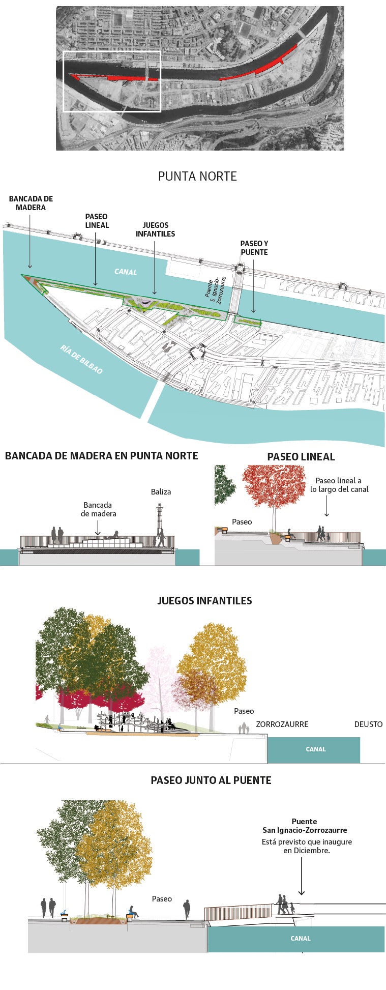 En total el paseo tendrá dos kilómetros de longitud, pero en primer lugar, a principios del año que viene, se va a empezar a trabajar en la urbanización del kilómetro y medio que se corresponde con los dos extremos. Se trata de los espacios ganados al canal con los rellenos, y de eso es de lo que estamos hablando. Esas zonas son oficialmente conocidas con la enrevesada denominación de Actuación Integrada 2 (AI2) del megaproyecto urbanístico de Zorrozaurre. Hagamos memoria: para darle al canal de Deusto una anchura uniforme que hiciese más eficiente el discurrir del agua en caso de avenida se ejecutaron esos rellenos en la isla. Las empresas que se encargaron de los trabajos, la UTE formada por Acciona y por Altuna y Uria, afrontaron el tajo a cambio de luego poder levantar ahí 780 pisos que les permitiesen rentabilizar la inversión (de unos 24 millones de euros).
