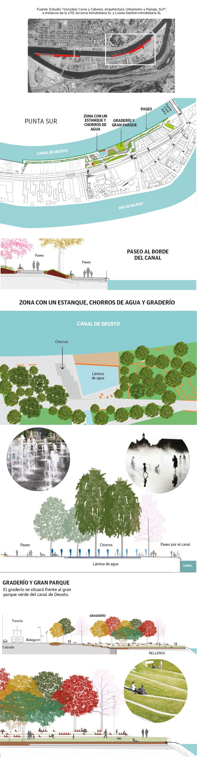 El otro segmento que se ubica sobre los rellenos y que es ahora objeto de desarrollo está al sur y comienza junto al puente de Frank Gehry. El primer tramo tendrá dos alturas: un paseo que discurrirá justo junto al canal a cota más baja, y otro más elevado al nivel de los solares contiguos donde se levantarán los edificios. Entre ambos escalones habrá una franja verde con arbustos y árboles.