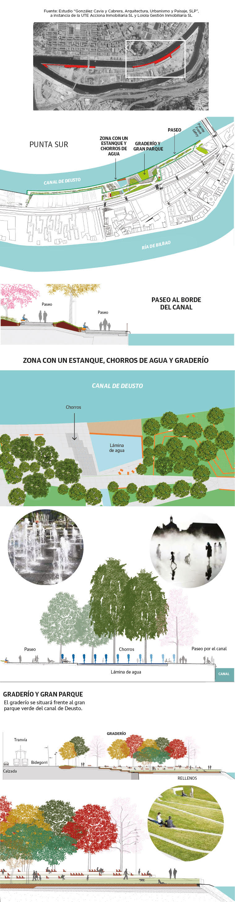 El otro segmento que se ubica sobre los rellenos y que es ahora objeto de desarrollo está al sur y comienza junto al puente de Frank Gehry. El primer tramo tendrá dos alturas: un paseo que discurrirá justo junto al canal a cota más baja, y otro más elevado, al nivel de los solares contiguos donde se levantarán los edificios. Entre ambos escalones habrá una franja verde con arbustos y árboles.