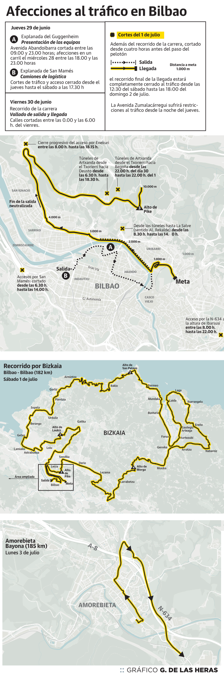 Ya desde el día 26, algunos consistorios comenzarán a prohibir aparcar en las calles por donde pasará la Grande Boucle, ya que el espacio tiene que quedar libre para la jornada del 28. Sólo en Getxo, por ejemplo, se van a suprimir cerca de 500 estacionamientos en la vía pública. Los días 29 y 30 habrá algunos cortes en Bilbao para garantizar la instalación de la zona de salida y meta. El momento de mayor restricción será el día de la prueba (1 de julio para la capital vizcaína y el 3 para Amorebieta).