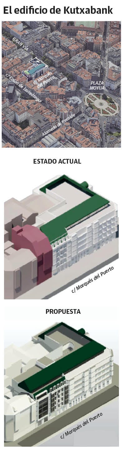 Kutxabank tiene un problema con una parte de su sede central, unas oficinas que ocupan la mayor parte de la manzana ubicada entre Gran Vía ... y la calle Marqués del Puerto, en pleno corazón de Bilbao. Su cuartel general está compuesto por varias construcciones anexas que se encuentran unidas entre sí, formando una 'L'. El asunto es que uno de estos inmuebles presenta un estado notable «de deterioro, con lesiones y patologías». Además, «no resulta funcional» y una posible reforma parcial sería difícilmente compatible con el resto de la sede, aseguran los técnicos que han analizado este asunto. Por todo ello, la entidad financiera ha tomado la drástica decisión de derribarlo.