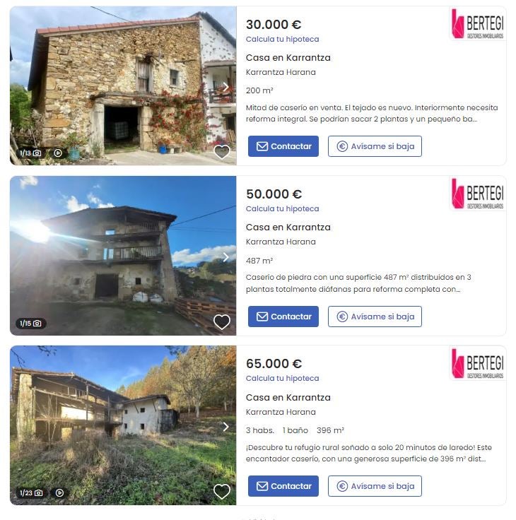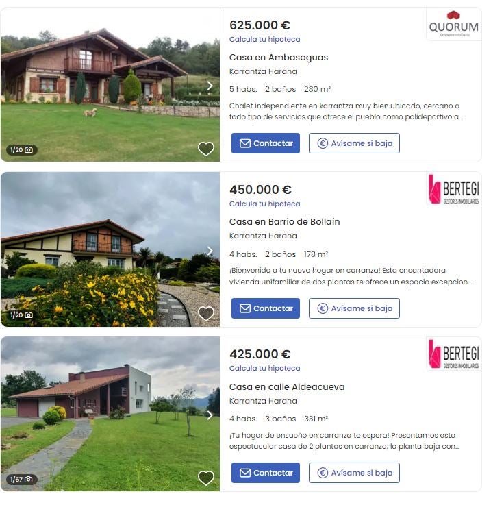 La mayoría de ofertas en Carranza, unas 40 en total, son casas y cuentan con muchos metros cuadrados, otra razón que abarata el precio medio. Un ejemplo de las más baratas. Está en venta medio caserío por 30.000 euros, unos 200 metros cuadrados cuyo interior precisa de «una reforma integral», advierte el anuncio. Otro caserío se oferta por 50.000 euros, con casi 400 metros cuadrados distribuidos en tres plantas. También precisa de una intervención importante. En el otro extremo, las ofertas más elevadas, se encuentran chalés que oscilan entre los 625.000 y los 425.000 euros.