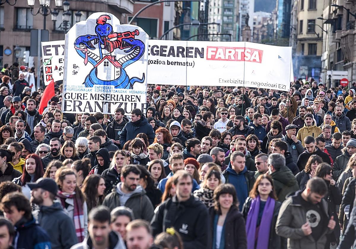 El debate de la vivienda estalla también en Euskadi. Unas 8.000 personas, según estimaciones de la Policía Municipal de Bilbao, han recorrido a primeras ... horas de la tarde las calles de la villa para exigir a instituciones públicas y partidos políticos una vivienda «digna, gratuita y universal». La marcha ha atravesado las principales arterias de la capital vizcaína y, como ha ocurrido con anterioridad en otras ciudades españolas, se ha desarrollado con absoluta tranquilidad y una cuidada puesta en escena.