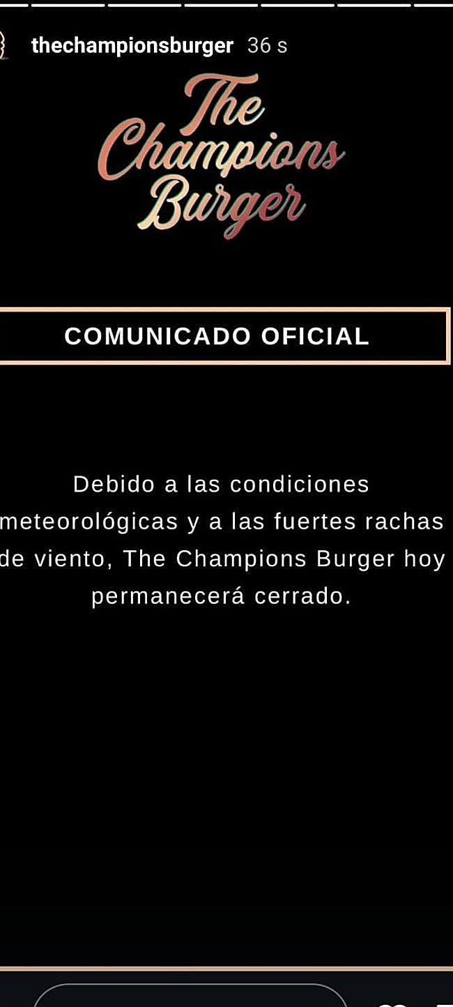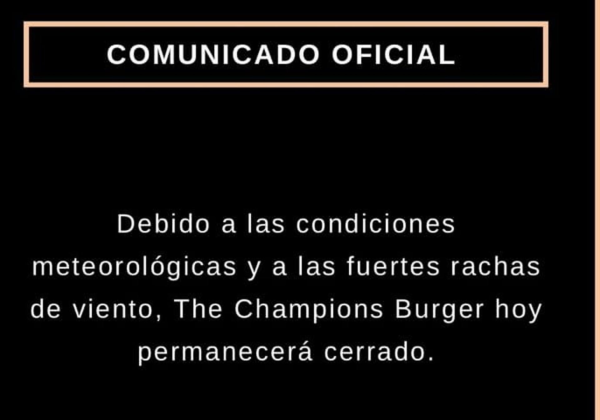 Estos hechos han provocado que la organización cerrara de inmediato el recinto para evitar males mayores. «Nos han dicho que diéramos a los clientes las hamburguesas que habíamos cobrado y que cerráramos las furgonetas». De hecho, poco después de las nueve publicó un comunicado en el que informaba de que «debido a las condiciones meteorológicas y a las fuertes rachas de viento, The Champions Burger hoy (por este martes) permanecerá cerrado». «Antes de que ocurriera todo, hemos ido a por sacos de piedras para poder fijar las carpas. El viento se ha levantado de forma repentina», explicaba otro trabajador. La organización ha desalojado la zona para evitar males mayores. Ya con la feria cerrada, seguían cayendo elementos como vallas y luces de colores además de varias plantas. Las carpas no paraban de agitarse y las fuertes rachas de viento levantaban arena y arrastraban las bolsas de basura.