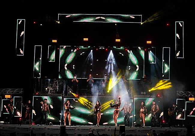 Formada por 26 artistas, Vulkano ofreció un show frenético de más de tres horas de duración, distintos estilos musicales y hasta treinta cambios de vestuario. Tan pronto sonaba Camilo Sesto y su 'Vivir así es morir de amor' que 'Debí tirar más fotos' de Bad Bunny o El Canto del Loco con su mítica canción 'Volverá'. «Cada pase, compuesto por varios popurrís, cuenta con un atuendo específico confeccionado por un modista en exclusiva para nosotros», explicaba a EL CORREO minutos antes de comenzar la actuación Carlos Rozas, director de la orquesta.