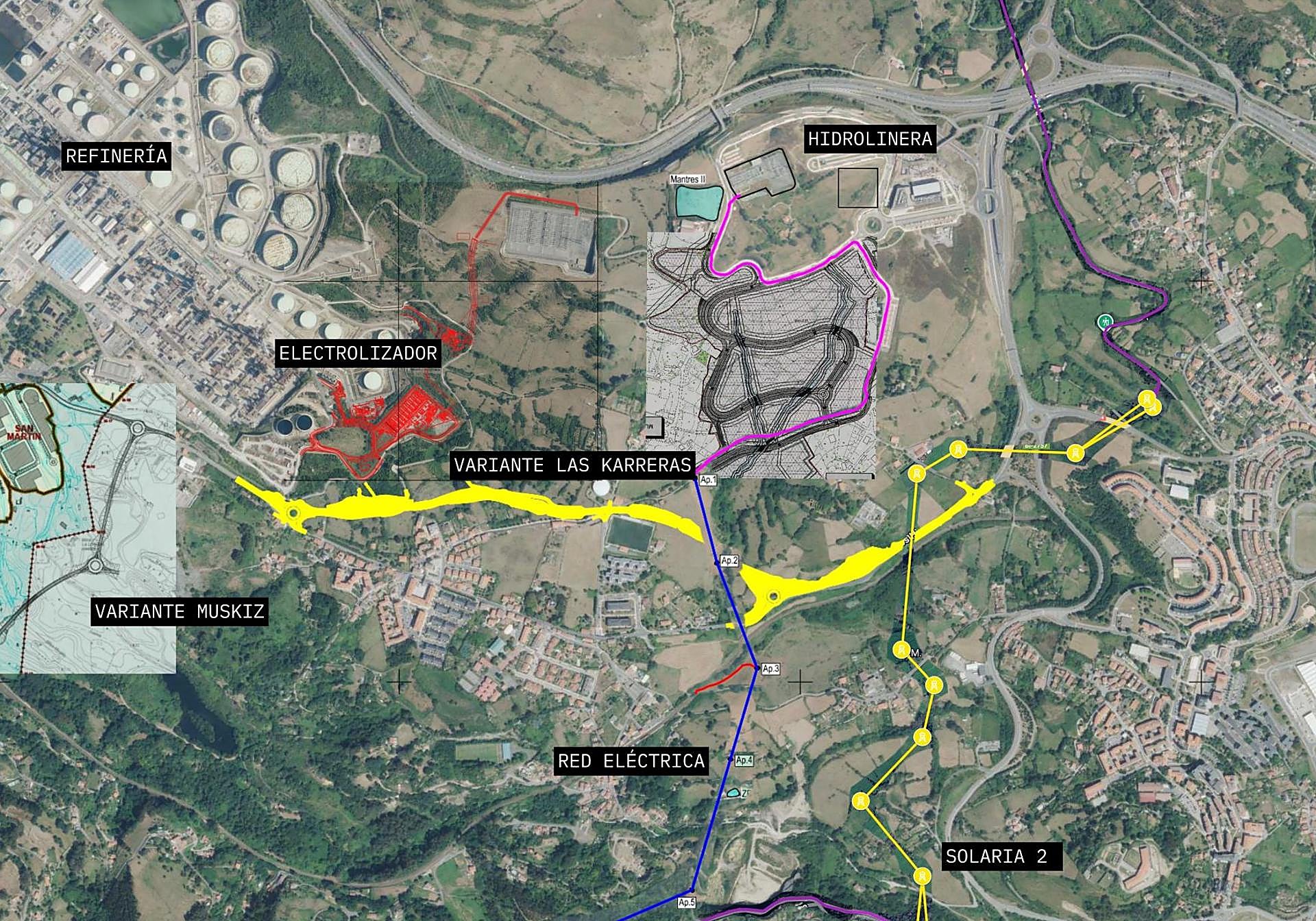 A estos planes se suman las variantes de Las Carreras y de Muskiz (esta pasa cerca del paraje natural del Pozo Gerente), la hidrolinera del parque tecnológico –«les permitirá sacar camiones los 365 días del año 24 horas al día», critica la portavoz– y el electrolizador de Petronor de 100 megavatios que busca obtener hidrógeno con energía renovable. «El pueblo está harto, cada vez nos afectan más los proyectos, Abanto no puede sostener tanto. Hablan de energía renovable pero son una contradicción. Estamos de acuerdo con el futuro sostenible pero no así, van a destrozar zonas naturales, expropiar huertas, pasar por entornos con animales protegidos como la tórtola y el visón europeo...», enumeró.