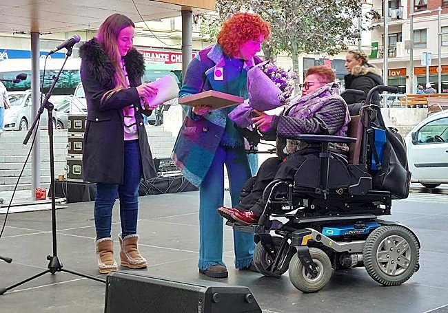 Tras premiar a los alumnos del colegio Calasanz por su trabajo en el concurso Beldur Barik, se ha procedido a homenajear a Maricarmen Azkona, miembro de la asociación de discapacitados de Santurtzi ADISA, por su labor por la igualdad. «Para mí supone una valoración por los más de 30 años dedicándome a visibilizar la violencia machista contra las mujeres, y en particular a las que tienen discapacidad. ¡No a la violencia contra las mujeres! », ha expresado la homenajeada.