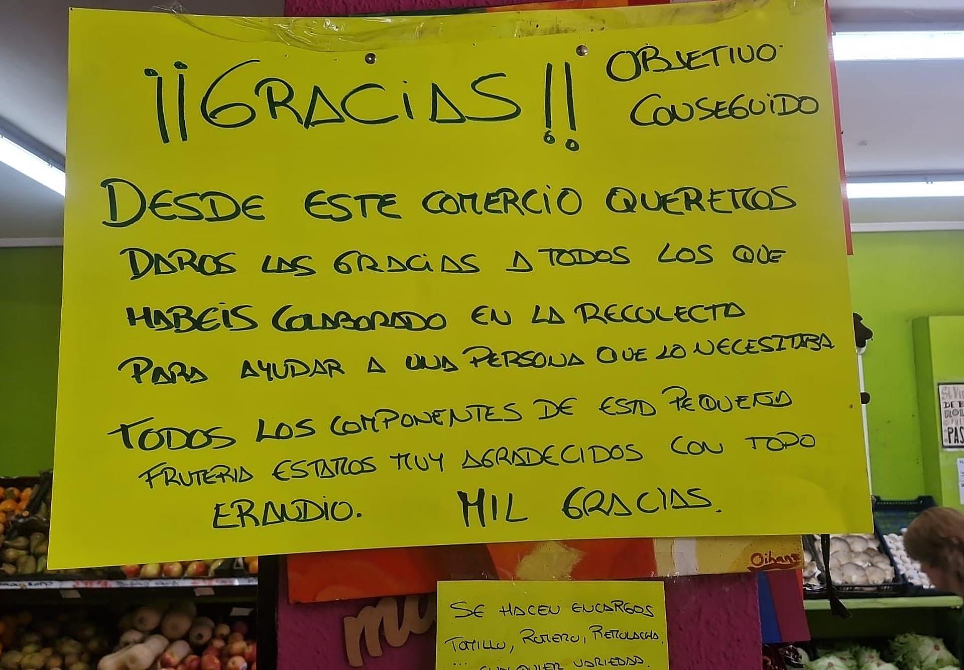 En la iniciativa empezaron a colaborar familiares y conocidos de los trabajadores de la frutería, pero gracias a la difusión se fueron uniendo vecinos y comerciantes de otras localidades. «Hoy he puesto un nuevo cartel en la frutería anunciando que cerramos el 'crowdfunding' porque ya hemos recaudado el importe y dando las gracias a todo el mundo. Creo que es importante hacer las cosas bien. Aún así, ha seguido entrando gente a la tienda para donar». «Cuando aún no sabíamos que la iniciativa iba a tener esta respuesta, hablamos con Mohamed y le dijimos que le íbamos a ayudar nosotros poco a poco para que al menos tuviera para comer, pero al final todo el mundo se ha implicado muchísimo y lo hemos logrado», cuenta Sonia.