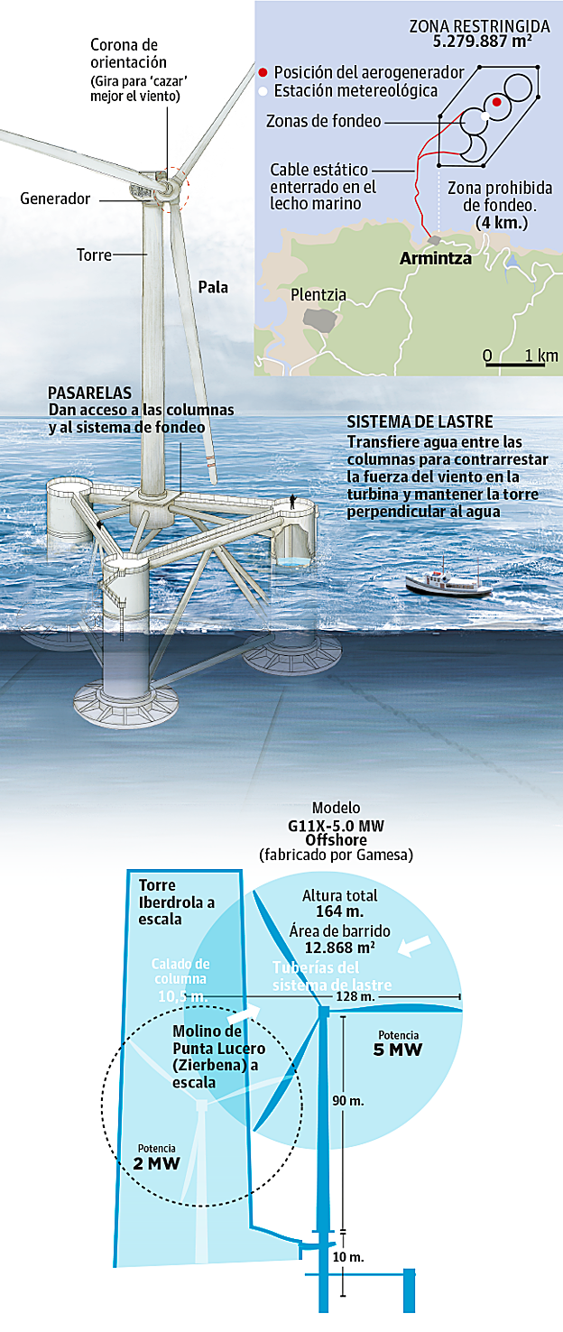 Finalmente, después de cinco años de tortuosa tramitación administrativa, el Gobierno vasco acaba de lograr el permiso para probar molinos eólicos mar adentro, frente a las costas de Armintza. El proyecto, pionero en España, prevé realizar ensayos con dos aerogeneradores flotantes al mismo tiempo. Los datos que se logren recabar (resistencia a los temporales, horas de funcionamiento, corrosión por la humedad, impacto sobre las aves...) serán de gran utilidad para la potente industria vasca del sector eléctrico, ilusionada ante las nuevas perspectivas que se abren.