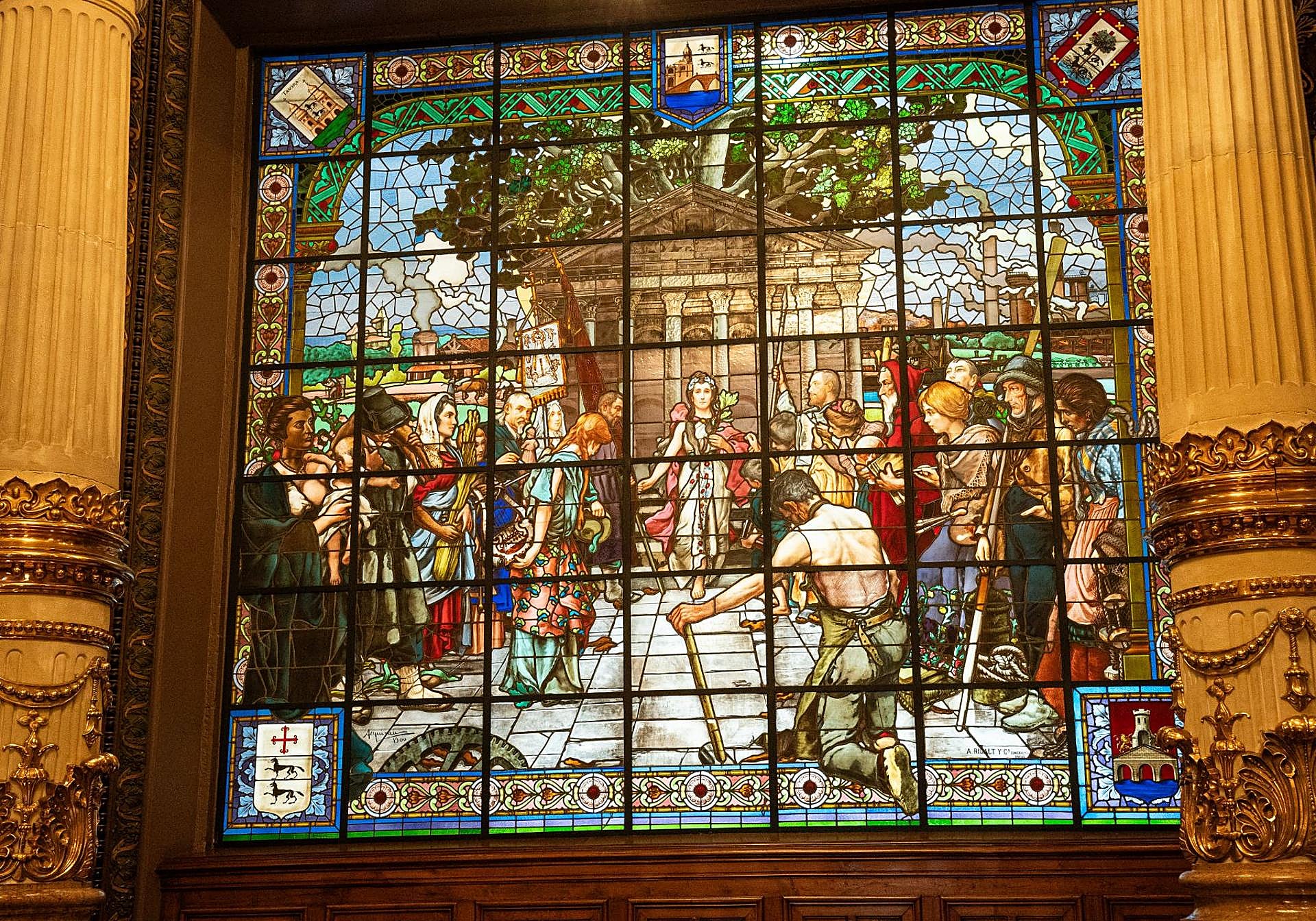 «Durante un tiempo he sido propietario accidental de un bien cultural que, en mi opinión, pertenece al pueblo de Bizkaia y de Bilbao», añadió Urricelqui. «Es parte de su patrimonio cultural, un testimonio de su capacidad creativa a través de uno de sus más insignes artistas y parte de un proyecto decorativo felizmente culminado y que hoy podemos disfrutar».Tras la entrega, Mikel Lertxundi, técnico del Departamento de Archivo y Documentación del museo, ofreció una conferencia en el salón de actos del Palacio, en la que explicó el programa decorativo del edificio, con especial énfasis en la vidriera, una alegoría de Bizkaia, su pasado y su futuro, unidos por la laboriosidad del país, en la que se representan sus oficios tradicionales, el comercio la industria, las artes, el saber y la religiosidad. Su concepción fue supervisada por una comisión integrada por políticos y los historiadores Jaime Labayru y Carmelo de Echegaray. Lertxundi destacó que a pesar de las restricciones que supusieron las detalladísimas instrucciones que recibió, Guinea logró incorporar elementos innovadores. Su diseño modernista fue un raro guiño a la estética contemporánea en un proyecto dominado por propuestas más conservadoras.