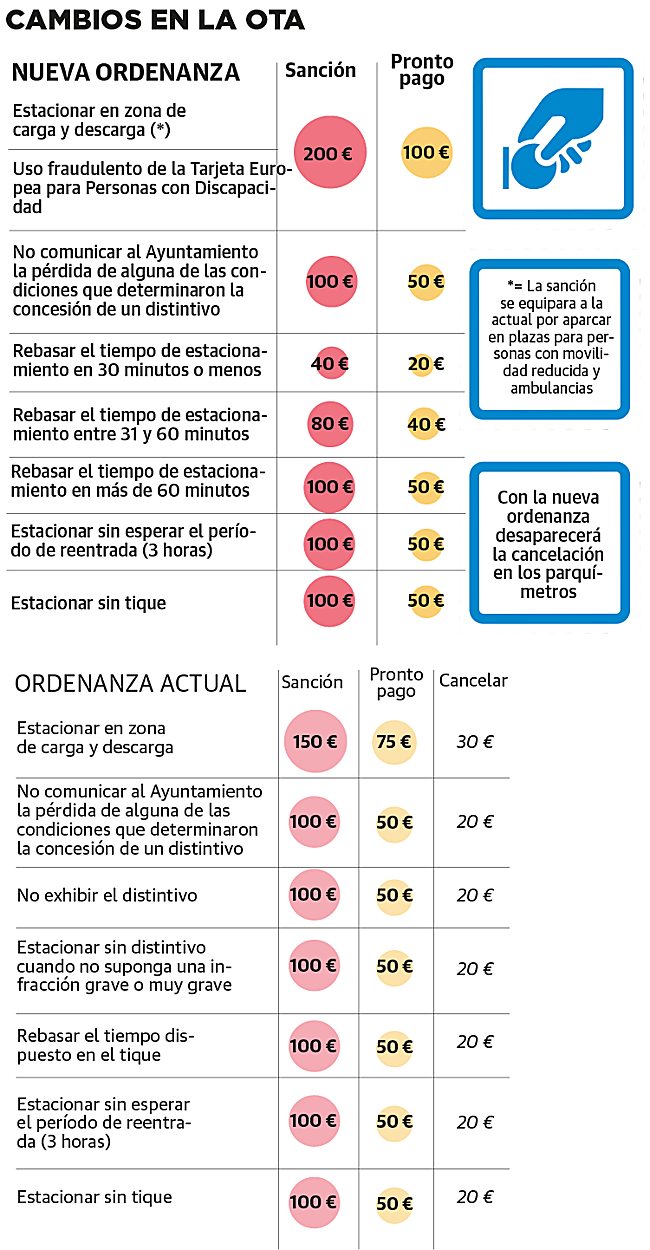Además, se encarecen las sanciones, no porque mayoritariamente aumente el importe de la multa, sino porque no se permitirá la cancelación en parquímetro; de ese modo, las infracciones más habituales (estacionar sin haber sacado el ticket, o pasarse más de 60 minutos de la hora «contratada») no podrán ser canceladas por 20 euros y como mínimo habrá que pagar 50 por pronto pago (la sanción es de 100 euros). La multa ya no estará en el parabrisas del coche, sino que llegará a casa, como cualquier otra. Por otra parte, los residentes pierden la posibilidad de estacionar dos horas gratis en zona azul.