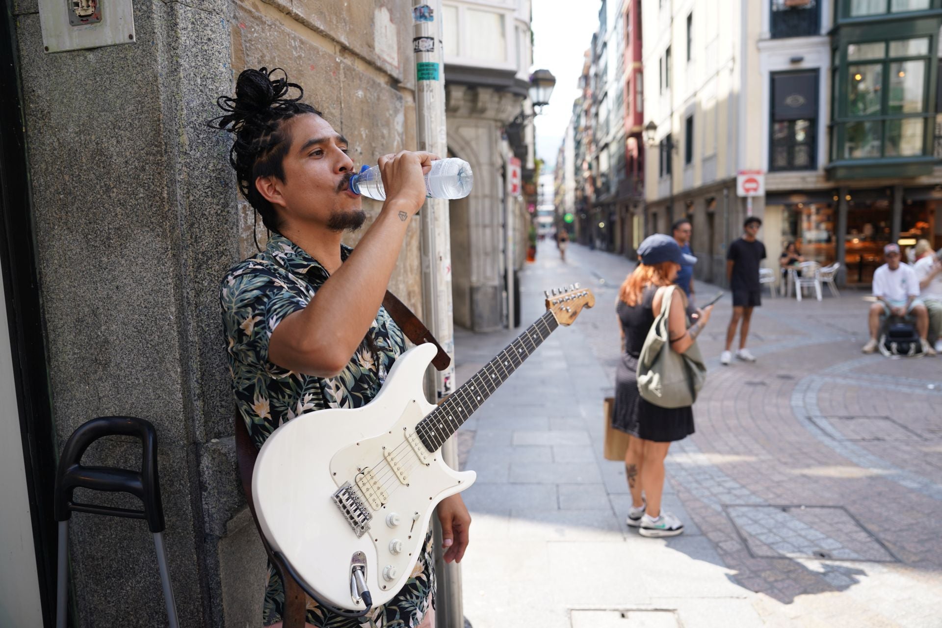 Las altas temperaturas no han impedido que bilbaínos y turistas salgan a pasear por la ciudad. Muchos han aliviado el sofocón refrescándose en las fuentes o comiendo helados. El Casco Viejo estaba a tope, y Alec Bedrot, músico de Perú, lo celebraba. «¡A mí me parece muy agradable! Cuando hace calor la gente está más animada y se nota la alegría. A mí me viene muy bien». Toca la guitarra junto al Portal de Zamudio, y ha escogido la esquina más cercana a la fuente para resfrescarse entre canción y canción. «Es muy importante mojarse la cabeza para no perder el conocimiento», dice.