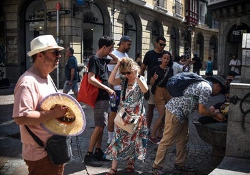 «Lo llevo fatal, la verdad. He venido sudando de casa. Tratamos de resfrescarnos, hidratarnos mucho y mojarnos el cuerpo: el cuello, la nuca...», explica Saioa Molero, guía turística bilbaína que desde hace un año trabaja como autónoma en el sector. Este lunes ha fibnalizado su tour en la plaza del teatro Arriaga en torno a las 13.00 horas. Un grupo de ingleses escuchaba atentantemente sus indicaciones mientras movían sus abanicos con garbo. Algunos, incluso, no han podido evitar salirse del corro para buscar la sombra. El calor apretaba con fuerza. «No están acostumbrados a estas temperaturas», relata. Saioa es una de las muchas personas que durante estos días busca la sombra en cada rincón o calle. «Me gusta ir a puntos fijos, pero con el calor a veces reubico la ruta. Yo siempre les digo que se hidraten». Trata de hacer su trabajo lo mejor posible para que los turistas se lleven una buena imagen de Bilbao, pero asegura que «tenemos que hacer un sobreesfuerzo para intentar entretenerles, porque a veces el calor aplatana. He llegado a trabajar con temperaturas de más de 40 grados, pero lo peor de aquí es la humedad».