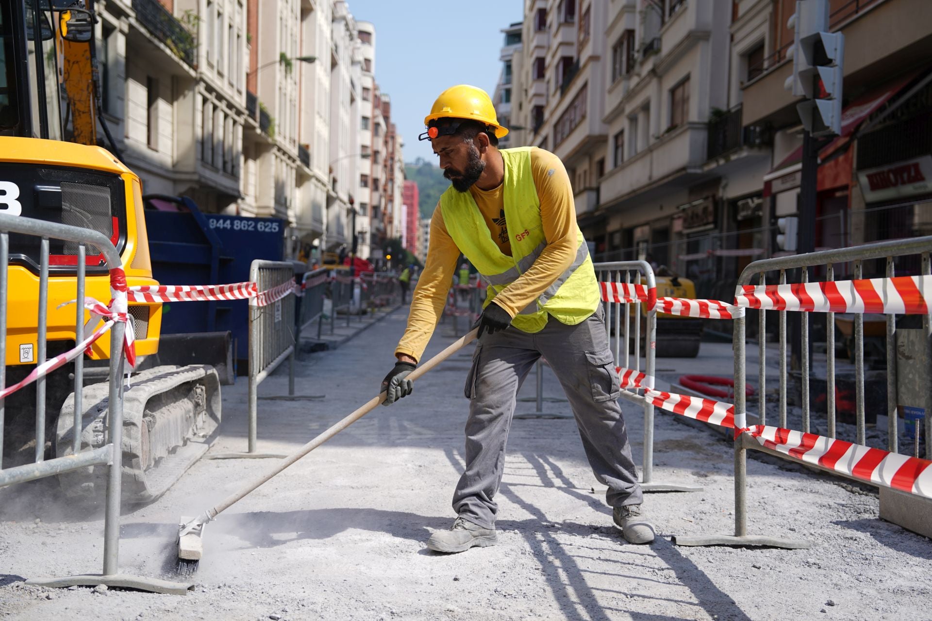 En la calle Máximo Aguirre de Bilbao varios operarios de obra trabajaban esta mañana sin descanso. Ángel Martínez, de Barakaldo, es experto en lidiar con las olas de calor. Lleva 30 años en el sector y a pesar de mantener el buen humor, asegura que «se lleva muy mal». «¿El truco? Ajo y agua. A veces nos ponemos cerca de la grúa del maquinista porque tiene aire. Pero vamos, intentamos beber todo el agua que podemos. Trabajamos de ocho a seis de la tarde. Si empieza a hacer mucho calor adelantamos la hora de salida a las cinco, y los viernes incluso antes», cuenta. A pesar de no soportar el bochorno, asegura que «la lluvia es mucho peor, porque se mete dentro del traje y no hay nada que hacer». «Siempre ha hecho mucho calor en verano, pero ahora creo que las olas duran más. Algunas veces intentamos entrar pronto por la mañana, pero hasta cierto punto, porque la maquinaria hace ruido y molesta a los vecinos».