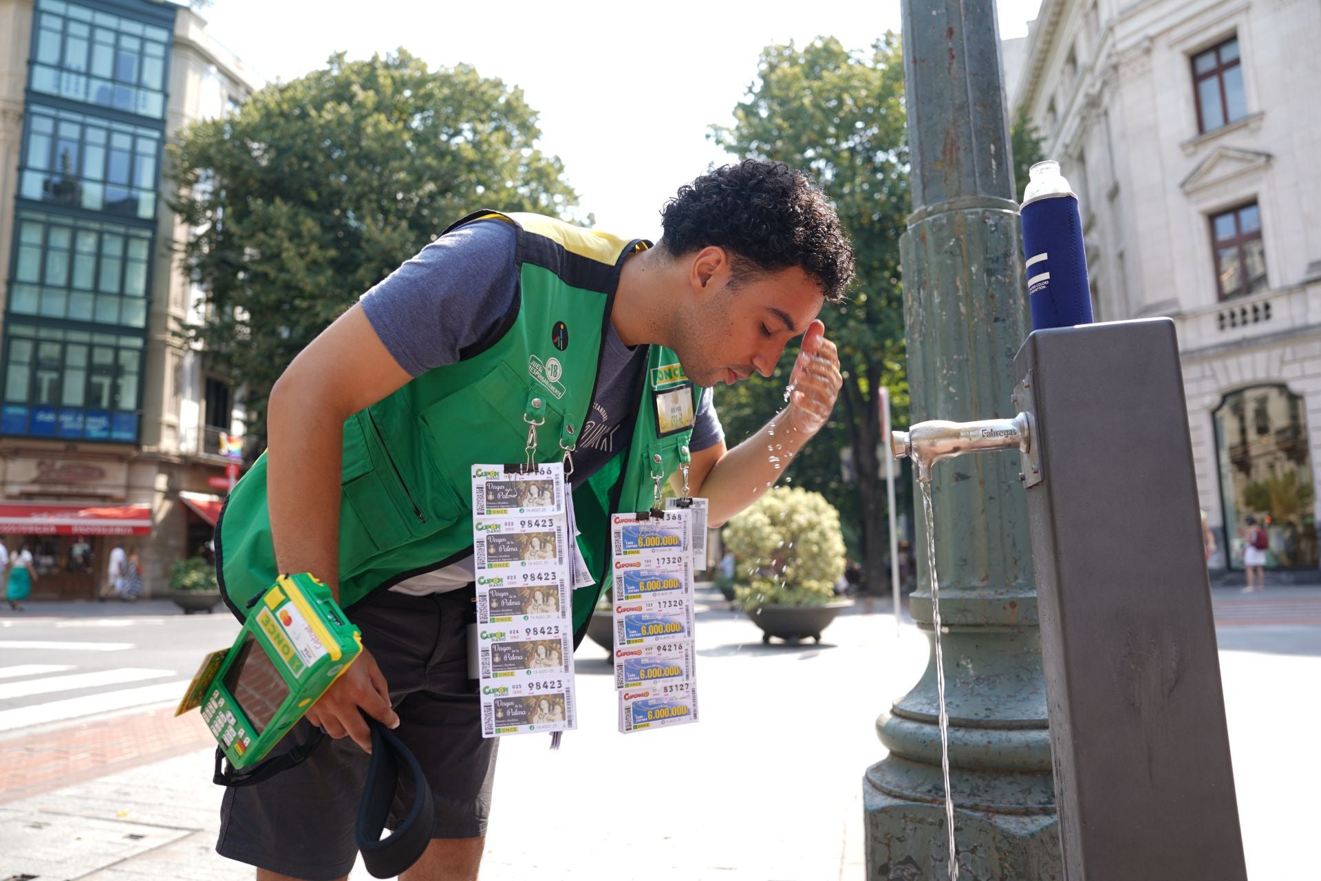 Continuamos el recorrido por la Gran Vía. Allí se encontraba Elvis Samuel Cruceta Piña, vendedor de la ONCE de 30 años. «Estoy acostumbrado a estas temperaturas. ¡Siempre me toca trabajar con olas de calor! Pero no pasa nada, sé llevarlo», comentaba entre risas. Por ello siempre va bien equipado. No se separa de su botella de agua y también come una onza de chocolate negro para tener más energía. Trabaja de 9 a 2 y de 5 a 8. Las horas en las que más aprieta el sol también tiene seguir vendiendo cupones en la Gran Vía, a pesar de que no haya ni un alma por la calle. No es de extrañar que en las horas más críticas haya habido algún susto. «Un día le dio un golpe de calor a una señora que pasaba por aquí. Le echamos agua en la cabeza y tuvimos que esperar para ver si mejoraba. A mí por suerte nunca me ha pasado, pero si ocurre ya sé lo que tengo que hacer».