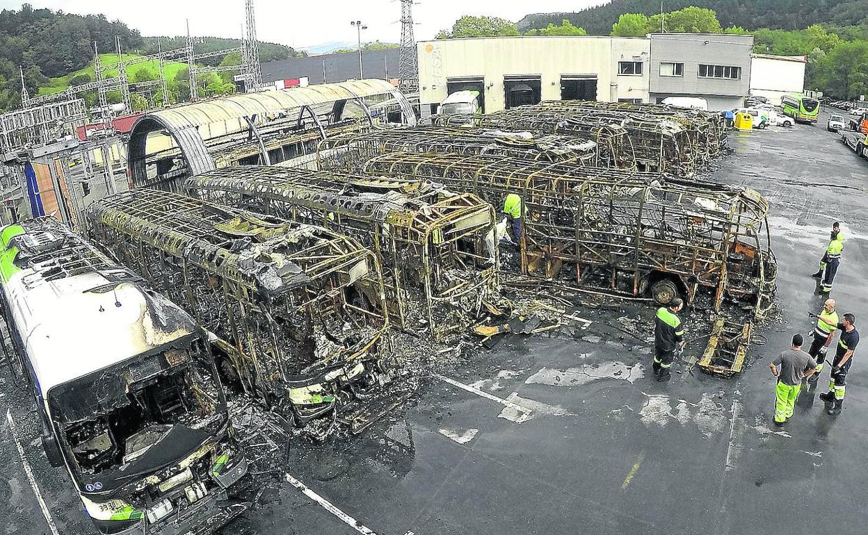 Explosiones y llamas de hasta diez metros acabaron con doce bizkaibuses en las cocheras de Lemoa