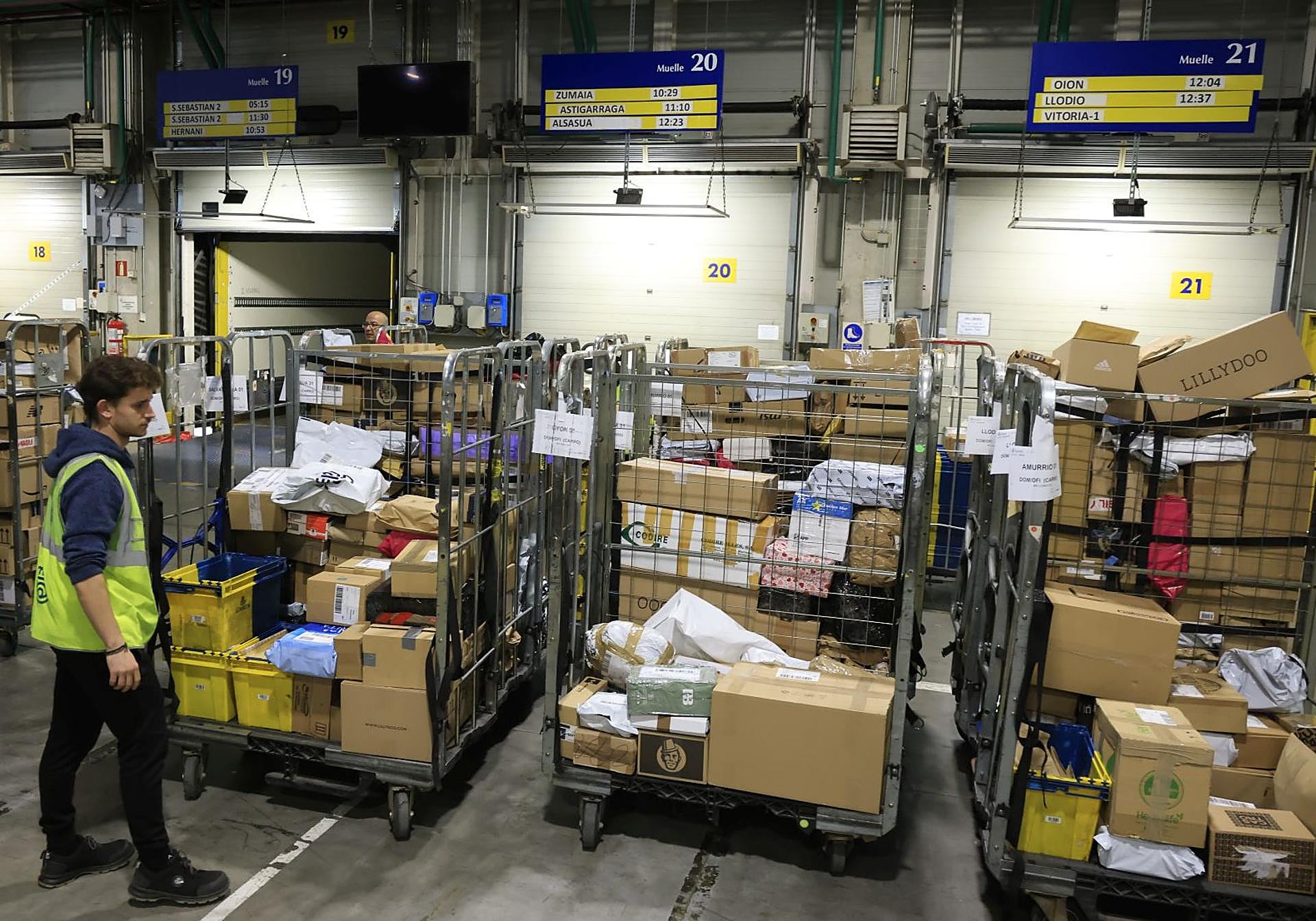 Estas instalaciones, situadas en el polígono de Jundiz, cubren Euskadi, Cantabria, La Rioja y Navarra. Aquí se procesan tanto los envíos que nacen en esas regiones (así de bonito lo dicen en argot postal, 'nacer') como los destinados a ellas, y eso supone un ciclo perpetuo en el que este pabellón inmenso se llena y se vacía, se vuelve a llenar y se vuelve a vaciar. Aquí sale lo mismo que entra, pero reordenado: los camiones traen contenedores, cuya carga hay que reorganizar en función de los municipios a los que se dirige. Hay tres horas punta cada día, y ahora estamos en la de la mañana, de ocho y media a nueve y media: no para el ajetreo de carretillas y transpaletas, de carros y jaulas que se van llenando. «En temporada normal tenemos unos 50.000 envíos diarios. En alta pasamos de 80.000», explica Ayuso. El récord en un día es de 92.000 paquetes, en la Navidad del año pasado, pero está condenado a durar poco, porque se bate todos los años: para esta campaña, la patronal de logística ha previsto un incremento del 8,7%. A partir de noviembre aumentan la plantilla, los turnos de trabajo, las horas de producción de la máquina... «Este lunes y este martes del Black Friday son uno de los momentos más fuertes del año», detalla la responsable.