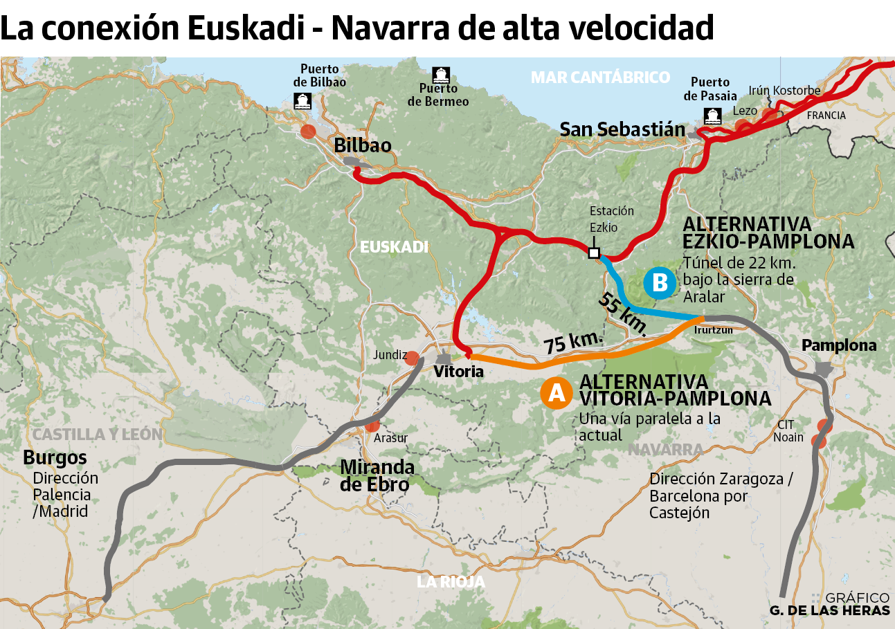 El estudio informativo elaborado por la ingeniería Sener que fue dado a conocer planteaba dos alternativas para unir Euskadi con Pamplona. Una por Álava atravesando Vitoria, y otra por Gipuzkoa desde la estación habilitada en la pequeña localidad de Ezkio-Itxaso. Se anunció que la decisión sería rápida porque el proyecto ya acumulaba un retraso considerable, pero casi ocho años después el Ministerio de Transportes sigue sin tomar la decisión definitiva.