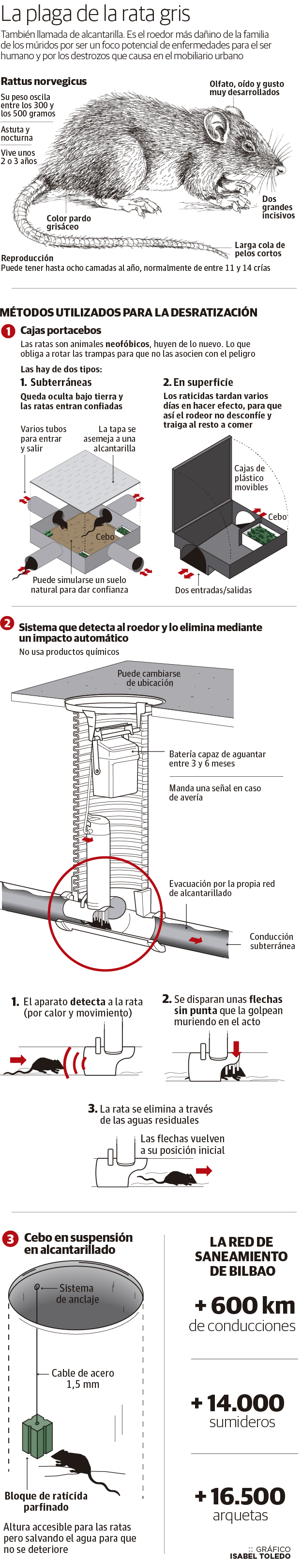 Esto no va a ser agradable... Hay gente para todo, sí, pero normalmente las ratas no le gustan a nadie. Y el problema es que ... cada vez hay más. Según los cálculos municipales, en Bilbao la población de estos roedores se ha duplicado en los últimos cinco años. Saber que bajo nuestros pies bulle otra ciudad húmeda y oscura poblada por unos 700.000 bichos repulsivos da repelús. También algo de miedo, porque se trata de una «seria y contrastada amenaza para la salud pública», dicen en el Ayuntamiento. La 'rattus norvegicus' es portadora de gérmenes y parásitos. También de un extenso abanico de enfermedades que van desde la peste a la listeriosis, pasando por la leptospirosis, salmonelosis, triquinosis, tifus... Ah, y si hay tantas es en buena medida culpa nuestra por cómo gestionamos nuestros residuos en casa...