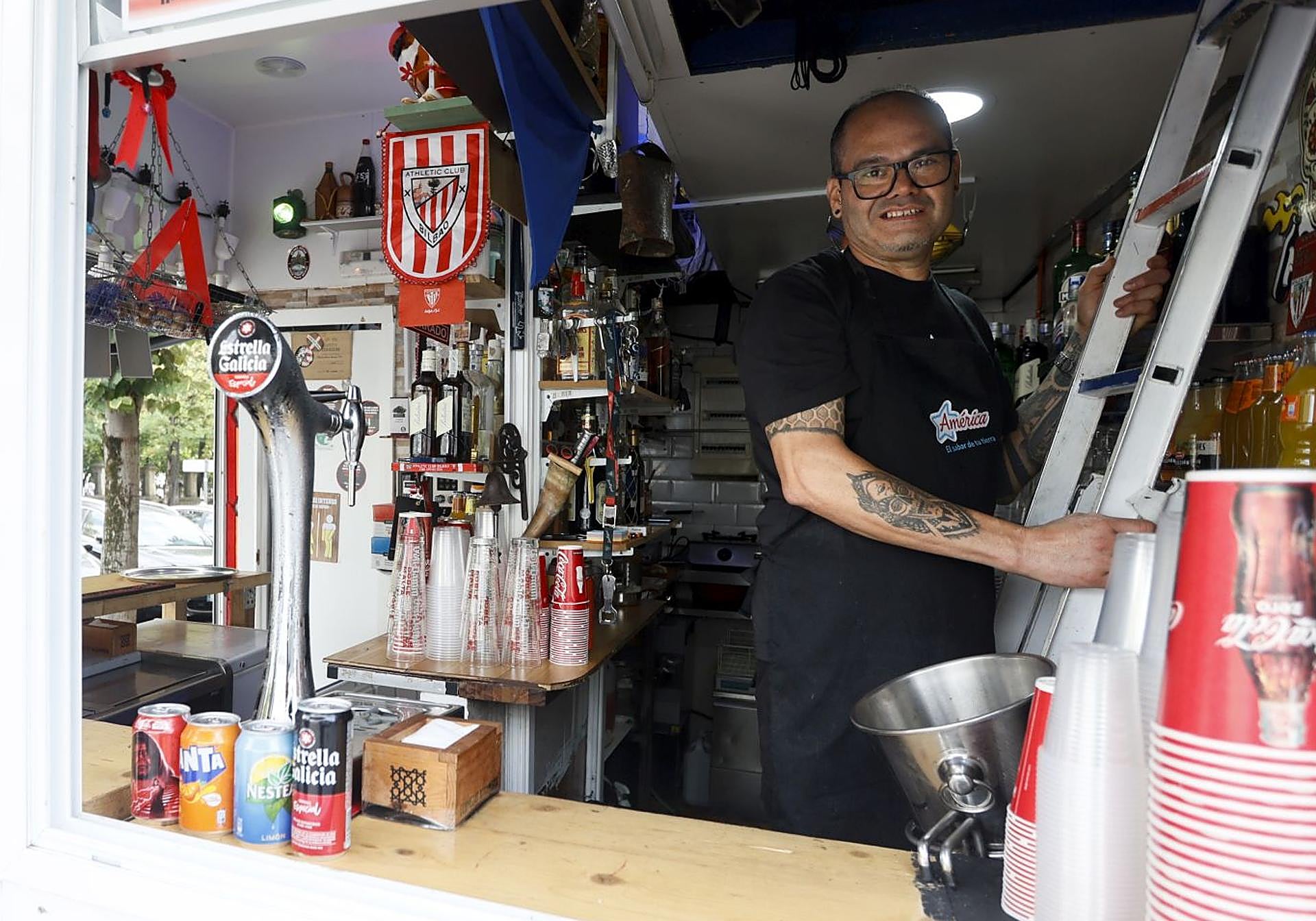 Es una esquinita minúscula, pero no se trata de una esquinita cualquiera: justo delante se alza San Mamés, hasta el punto de que casi no se ve otra cosa que su emblemática fachada. Calcula David Serrano que son «dos por dos metros», con un altillo del mismo tamaño al que trepa por una escalera de pared, y el aforo es también de media docena de personas, pero eso ya no importa: hace un par de años, David decidió 'cerrar' el bar y convertirlo en algo más parecido a un quiosco, para atender su terracita de cuatro mesas y, los días de partido, abastecer a la multitud futbolera de «copas, ñam ñam y jajajá», como dice su eslogan. «Yo llevo doce años y antes se entraba, claro. Tenía que subir los barriles arriba, porque aquí no quedaba espacio. Cuando llovía, se apalancaban y llenaban el bar, y tenía que andar pidiéndoles si se podían mover, encajándolos. Una vez se colocó aquí un señor bastante... gordo y ya no podía entrar nadie: se puso burro, intenté sacarle pero no podía con él. Hoy la gente se sorprende de que haya baño».