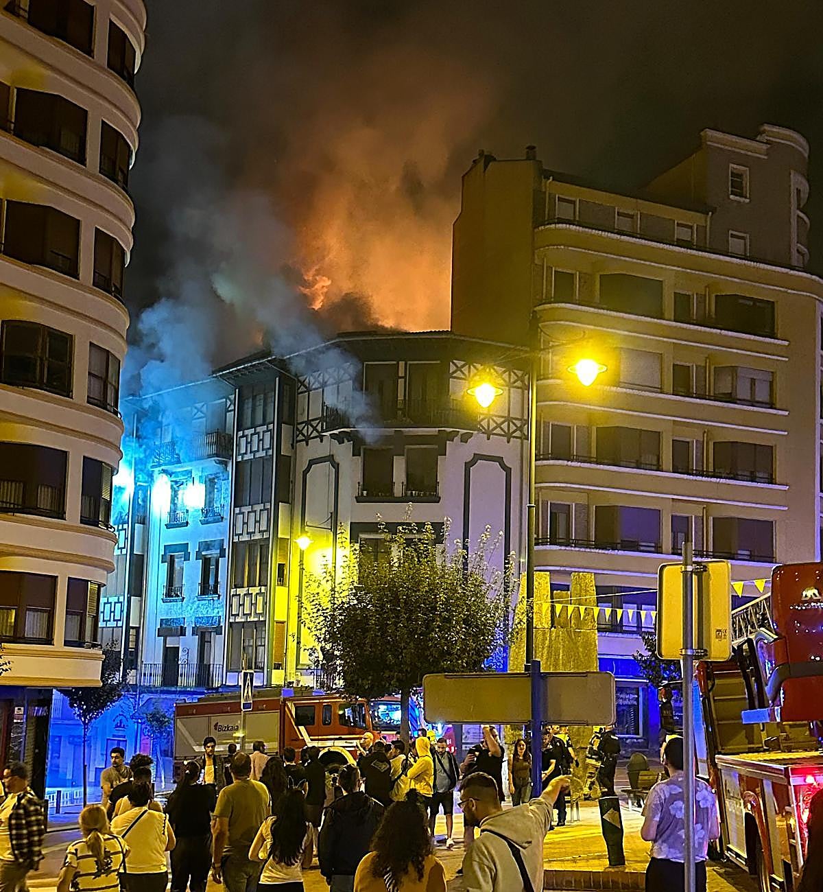 El jefe de guardia del servicio de Bomberos de la Diputación, Ibon Bijueska, ha explicado que «las condiciones dentro eran desfavorables t han decidido saltar». Según ha detallado, el tercer y el cuarto piso del número dos son los más afectados además de la cubierta. «Todavía estamos en fase de extincion y no ha arrancado la investigación», ha añadido.