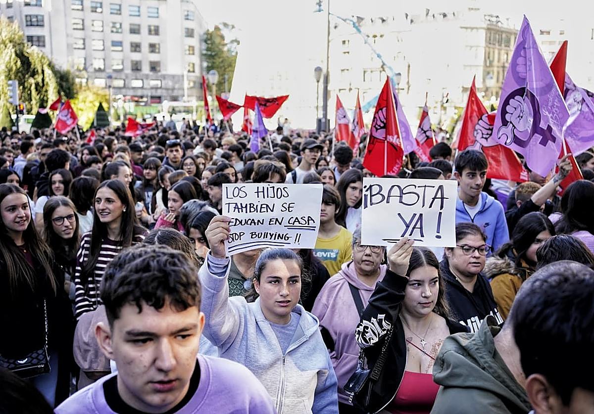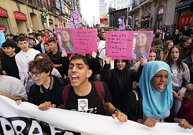 En Euskadi la manifestación estaba convocada en las tres capitales a las doce del mediodía, aunque el paro académico se alargará durante todo el día. En Bilbao la protesta ha arrancado a la hora prevista desde Moyua, donde se han concentrado cientos de estudiantes a los que se han ido uniendo decenas más a lo largo del recorrido hasta la plaza del Arriaga. Junto a los grandes grupos de adolescentes han marchado también profesores y padres. Durante el recorrido, en el que se han visto carteles con la imagen de la adolescente sevillana, se han escuchado lemas como «Discursos de odio fuera de las aulas», «Fuera matones de nuestras aulas», «Los protocolos sin recursos son una mierda» o «Basta ya de acoso criminal». Al final de la marcha se ha guardado un minuto de silencio por Sandra y se ha leído un manifiesto.