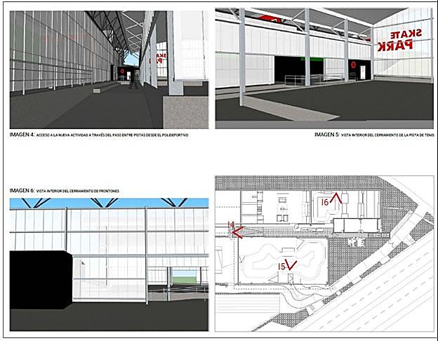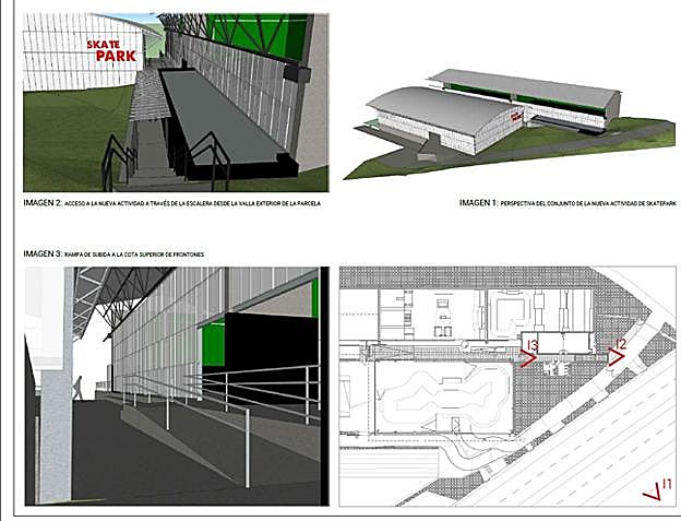 En total, se actuará sobre 826 metros cuadrados. En el actual frontón 5 se instalará una 'street área' de 372 metros cuadrados y en en el 6, habrá otra de 330 destinada a los cursillos de iniciación. Ambas serán de madera. En un habitáculo soterrado que se utilizaba como vestuario y almacén se instalarán los baños: un aseo mixto de cinco personas y un aseo para personas de movilidad reducida. Por otro lado, también se levantará un espacio de 100 metros cuadrados que albergará dos aulas y una oficina.