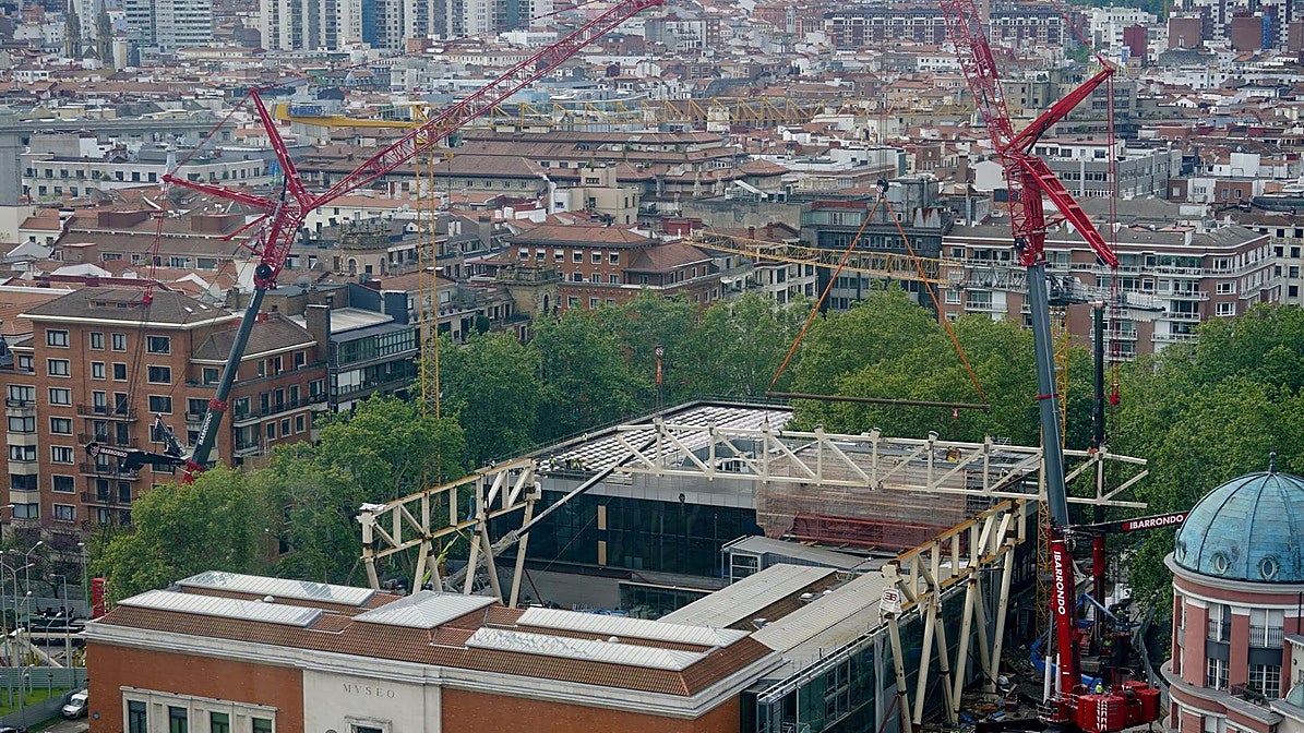 La silueta de las grúas asomando por encima del vallado de la obra de ampliación del Museo de Bellas Artes de Bilbao llama la atención a todo el que pasa junto a ellas. En este caso la fascinación está más que justificada, porque la mayor de ellas es un modelo mastodóntico. Tanto, que solo existe otra igual en toda España. Esta misma mañana, Norman Foster, el arquitecto británico que firma el nuevo diseño, podrá contemplar cómo trabajan a destajo y la evolución de la obras que acabarán por colocar una 'boina gigante' sobre la estructura actual.