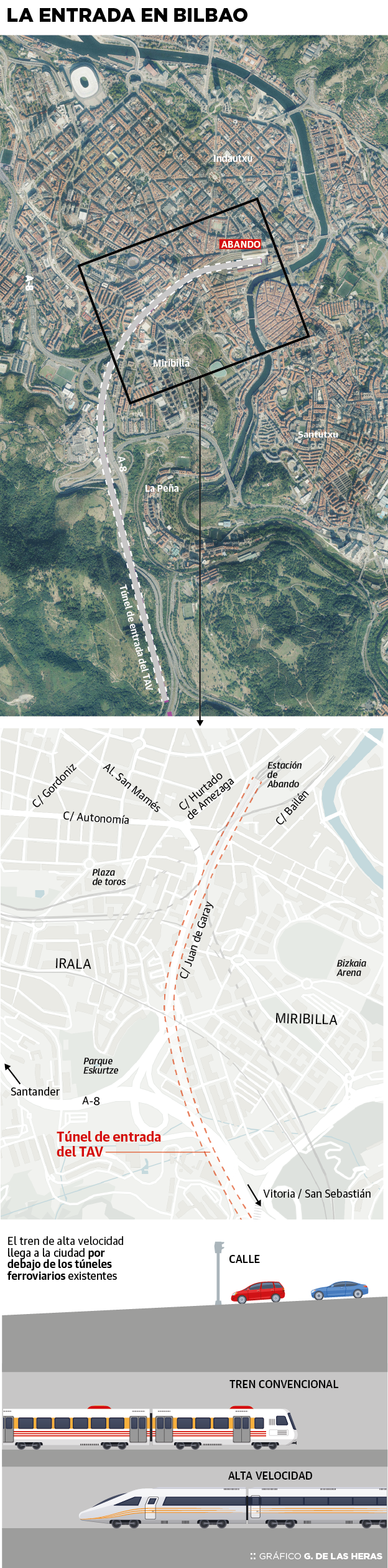 El 'supertúnel' tendrá una longitud cercana a los 7 kilómetros. Aunque el diseño definitivo le corresponderá a Euskal Trenbide Sarea -sociedad pública dependiente del Gobierno autonómico-, ya están sobre la mesa los primeros esbozos. El TAV entrará en la nueva galería cuando supere el viaducto de Zaratamo y avanzará bajo tierra en paralelo a los túneles de Malmasin y la A-8 descendiendo progresivamente hasta quedar bajo la autopista a la altura de La Peña. En el entorno de Larraskitu el trazado soterrado girará hacia San Adrián para encarar después la calles Juan de Garay y llegar a la estación de Abando por la actual playa de vías.