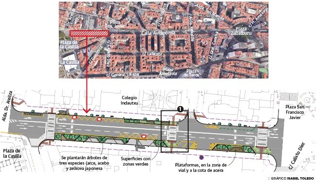 Se sigue así con el modelo que se está extendiendo por el resto de la ciudad, según el cual pierde peso el asfalto en favor de las zonas peatonales y el verde. En este caso, habrá cierta continuidad con lo ejecutado en Sabino Arana y en María Díaz de Haro, zonas próximas y pacificadas.