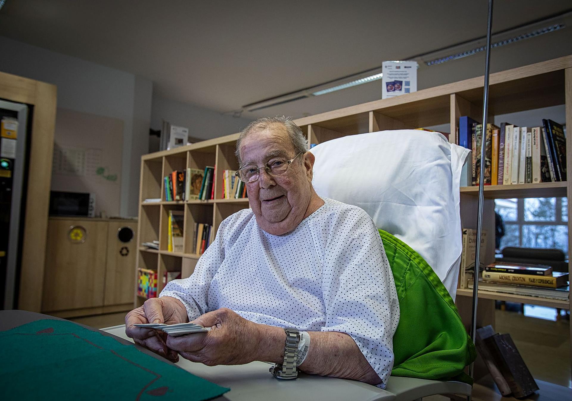 Hace unos días, se plantó. «Me tuve que enfadar y decirle a mi hija que se fuera a dormir a casa, que yo me podía quedar solo». Lo de enfadarse en una forma de hablar porque Javier Viguri (Nanclares de la Oca, 80 años) es un hombre afable con pinta de haber dado pocas voces. Lo de quedarse solo tampoco es así porque nunca lo está. «¿Qué tal, Javi. Cómo vas?», «espera que te peino un poco para la foto». «Me asean y me perfuman todos los días. Esta gente es majísima, a muchas enfermeras y auxiliares las conozco por el nombre».