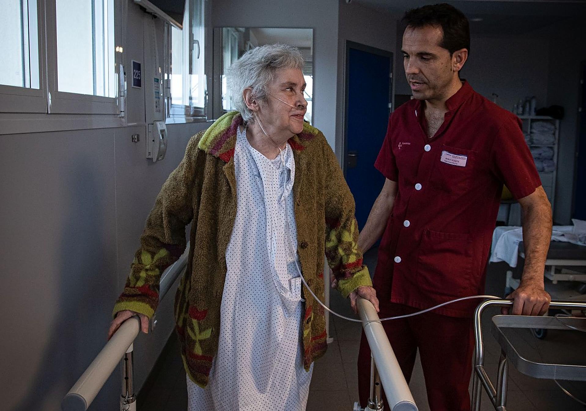 «No hace falta que poses para la foto, que vamos a salir elegantes de todos modos». A Iciar (Rekalde, 67 años) le da casi la risa. Y sigue, obediente, con la rutina. «Cogemos aire por la nariz y soplamos largo, largo, largo... Recuerda, respira despacito y camina suave, suave, a esa velocidad vas bien», le anima Borja Ugarte, responsable de 'Mugigela', un servicio para recuperar la movilidad que el hospital de Santa Marina lleva un año largo ofreciendo. «A una persona mayor, diez días en la cama le dejan barrido. Llegan caminando al hospital y resulta que luego, aunque se curan médicamente, no son capaces de ponerse de pie». Es el caso de Iciar. Ha estado ingresada en el servicio de neumología más de dos meses. «Cuando empecé con Borja no era capaz de dar tres pasos, pero mira ahora. Él me 'aprieta' y me viene fenomenal».