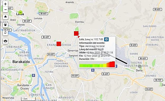 El caza F-18 que en la noche de ayer sobrevoló el Txorierri causó un estruendo de 103 decibelios. Así quedó registrado en los sistemas ... de monitorización de ruido de los que dispone el aeropuerto de Loiu. Este pico de contaminación acústica es posiblemente el valor más alto que nunca han dado estos aparatos de medición desde su entrada en funcionamiento en marzo de 2019. Un avión normal suele generar un impacto de entre 60 y 70 decibelios. Un 'Antonov' que partió del aeródromo vizcaíno en septiembre de 2019 cargado de bombas generó un ruido excepcional de 77 decibelios.