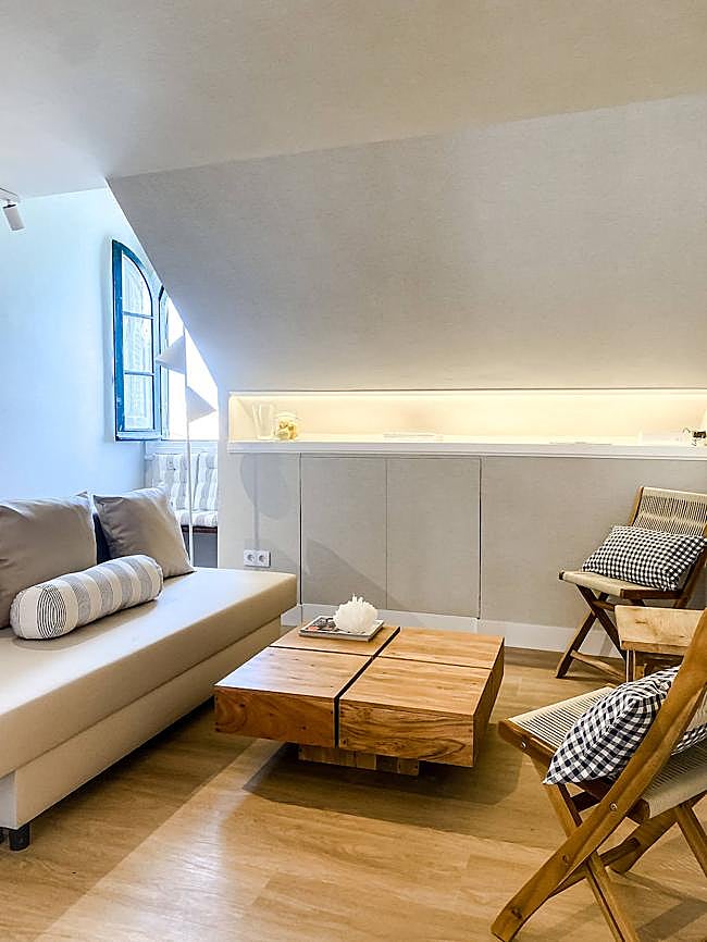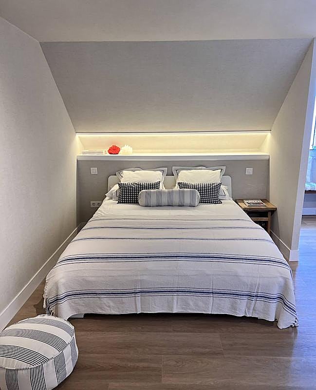 Las creativas han cumplido a la perfección el deseo de los propietarios: actualizar el piso sin perder su esencia. «Contactaron con nosotras con la intención de reformar la vivienda y convertirla en su apartamento de verano: actual, fresco y acogedor al mismo tiempo», explican Memé y Cecilia. El ático parece sacado de un cuento: decoración minimalista, techos abuhardillados, contraventanas de madera, carpintería a medida, tonos beiges y cálidos… Todo perfectamente recogido en 54 metros, lo que lo convierte en un refugio singular con un encanto único. «Nos decantamos por un planteamiento diáfano y polivalente: un amplio espacio donde conviven salón y una habitación principal, otra independiente, baño completo y cocina», concretan.
