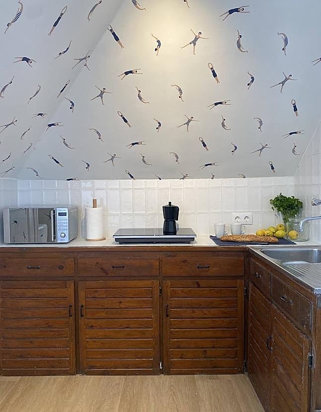 Memé y Cecilia han apostado por darle un toque moderno a través de los materiales, pero respetando el estilo clásico que lo caracteriza y manteniendo la armonía a nivel visual. Para ello, han optado por un mobiliario simple para que la propia estructura sea la verdadera protagonista. «Sustituimos la moqueta centenaria por un laminado de madera en todas las estancias. Además, empapelamos las paredes, los techos del salón y el de la habitación para darle calidez. Para el baño y la cocina, nos decantamos por un papel de nadadoras 'vintage' súper divertido y fresco, ¡todo un acierto!», señalan. De hecho, es uno de los puntos fuertes del diseño de esta vivienda; recuerda a los días de verano en la playa, al buen tiempo y al sol, aunque a veces se resista a salir en el norte.