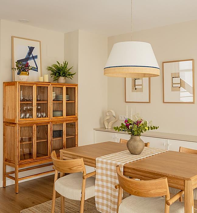 En la planta baja del adosado se encuentran el comedor, la zona de estar, la cocina y la habitación principal. «Esta planta estaba concebida como un espacio diáfano, y la estructuramos en varias zonas conectadas entre sí, tanto visual como funcionalmente», explican. Así, al entrar en la vivienda, lo primero que encontramos es el comedor y la zona de estar. El comedor está presidido por un mueble a medida en blanco y arena, que se complementa con una vitrina de madera que dialoga con la mesa y las sillas, generando una atmósfera acogedora y coherente.