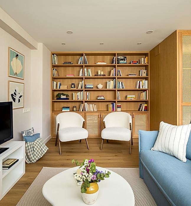 Desde la escalera con listones de roble descendemos al nivel inferior, donde se encuentra el txoko, uno de los espacios más especiales de la vivienda y en el que tampoco falta el toque marinero que recorre toda la decoración. «Está concebido como un rincón chilled-out, pensado para relajarse, y donde hemos podido arriesgar un poco más, consiguiendo un ambiente muy versátil». Para ello, han combinado un sofá cama azul -más grande que el del salón- con butacas blancas y una librería a medida en roble barnizado y fibras naturales, muy espaciosa, que enmarca un rincón de lectura único y muy personal. Junto a este ambiente distendido, el lavadero sorprende por su amplitud y capacidad de almacenaje, con armarios en gris claro y roble que repiten el patrón vertical de las escaleras. El baño, en esta misma planta, mantiene la estética general con un mueble azul de rayas verticales y acabados en tonos arena.