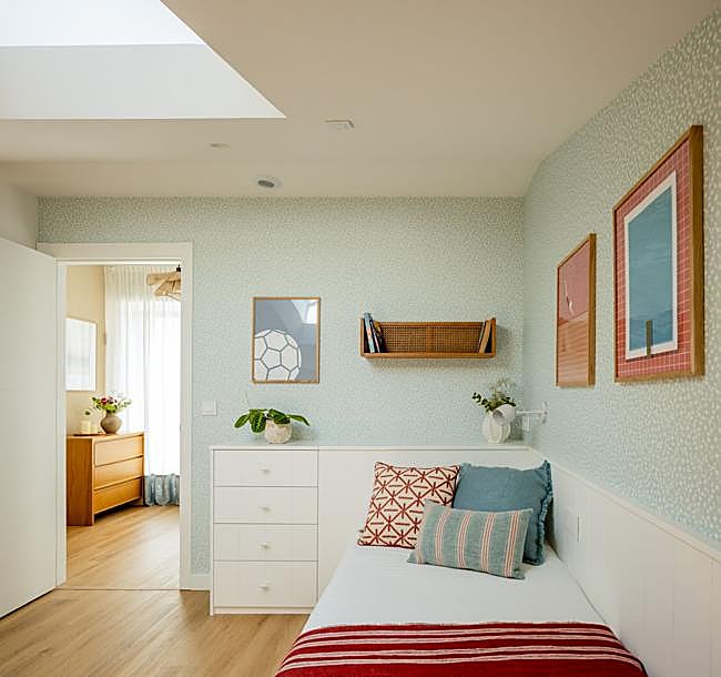 En la planta superior se encuentran las habitaciones de las dos hijas adolescentes. «Aunque comparten una distribución similar y elementos de carpintería en blanco y madera, cada estancia refleja la personalidad única de sus ocupantes. Cada una ha elegido los complementos decorativos que representan sus aficiones: a una le encanta el fútbol y a la otra, el ballet», detallan. Por eso, los papeles pintados en tonos azules, las camas, los cuadros y los textiles fueron cuidadosamente seleccionados para crear dos ambientes independientes pero en armonía. El diseño también tuvo en cuenta las particularidades arquitectónicas, como la forma abuhardillada, optimizando al máximo el almacenamiento sin renunciar ni al confort ni a la estética.
