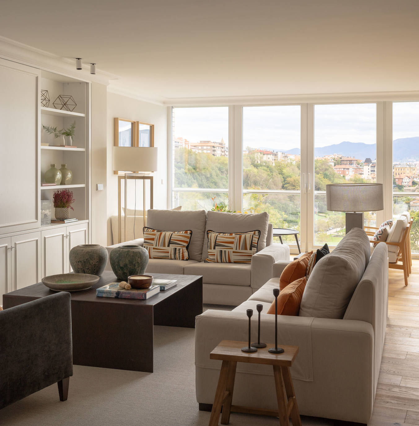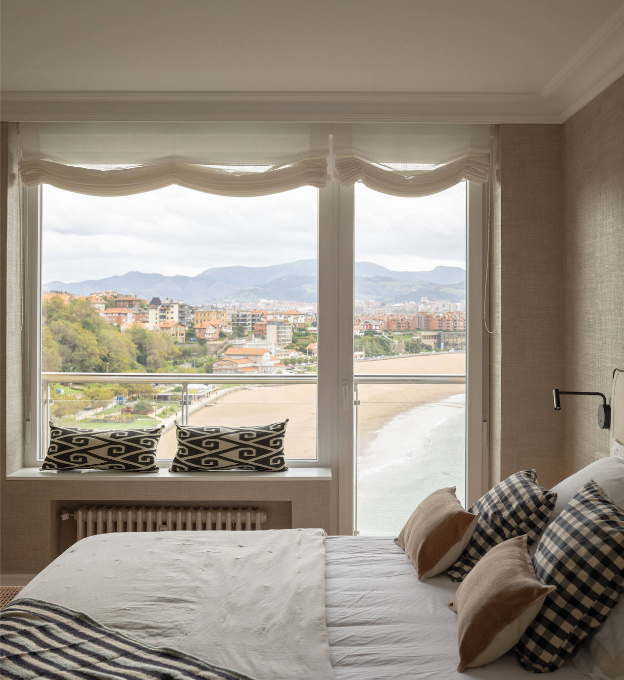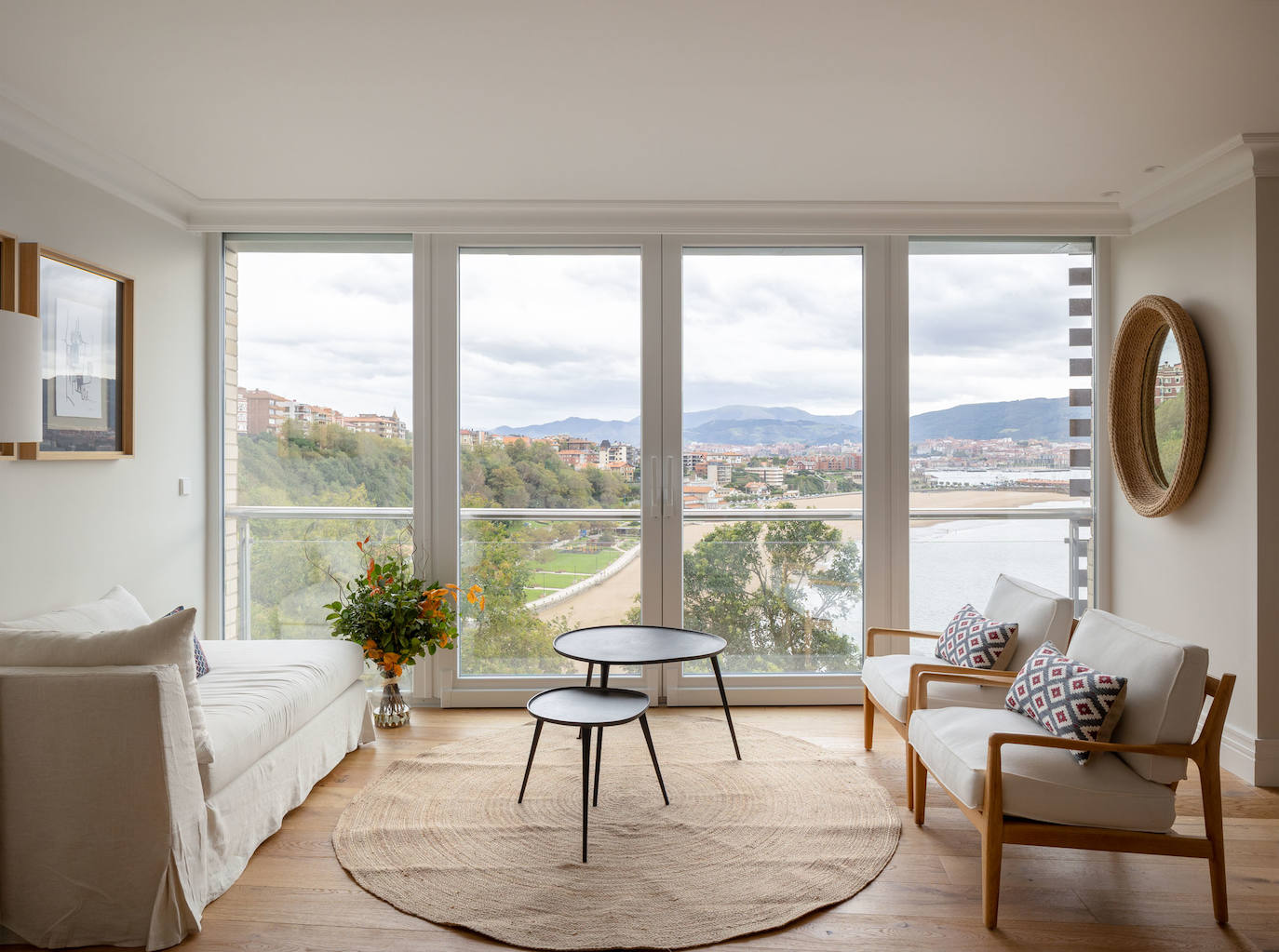 Esta vivienda, situada en Getxo, dispone de 155 metros cuadrados, pero su mayor atractivo es su espectacular vista panorámica a la playa de Ereaga y al emblemático Puerto Viejo. «La ubicación es privilegiada. Las vistas hacia la bahía nos obligaban a orientar las zonas de más uso hacia al mar. Nos pareció una gran oportunidad para ampliar al máximo la perspectiva desde el salón y la habitación principal para conectar la casa con la naturaleza, consiguiendo un equilibrio perfecto», explica.