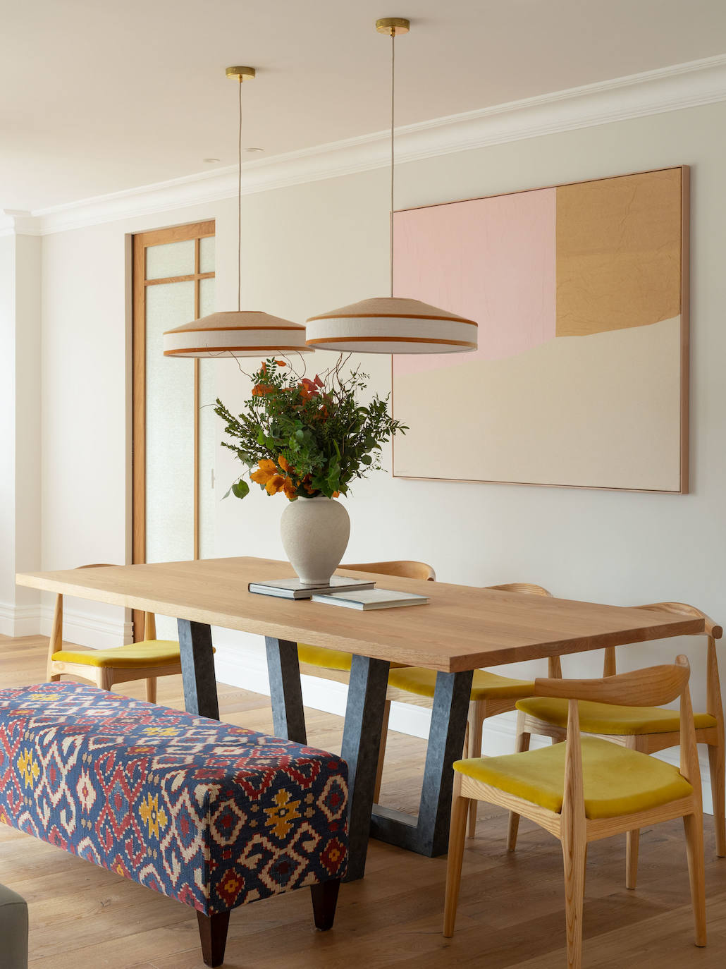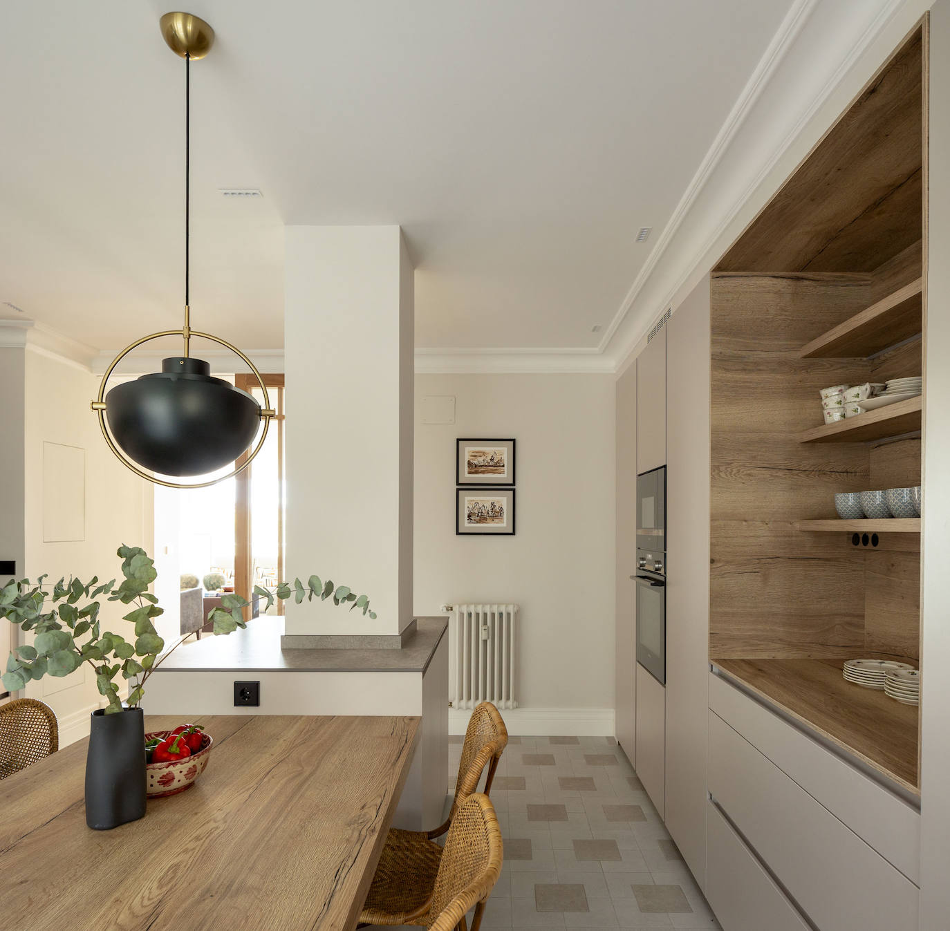 Estos emprendedores han apostado por un estilo depurado manteniendo el toque actual de la arquitectura. «Tiene características clásicas, como las molduras en las carpinterías y las cornisas, pero lo hemos combinado con mobiliario y detalles de diseño contemporáneo». Predominan los tonos cálidos, que aportan luminosidad y convierten la vivienda en un lugar acogedor donde se respira calma en cada esquina. Olatz ha cuidado hasta el último detalle. Algunos espacios, como el baño o las habitaciones de los hijos, están empapelados con diseños cuidados y finos. «Queríamos darle un toque más personal para ganar viveza. El papel lo utilizamos para subir los tonos y darle otra gracia». La arquitecta ha mantenido una estética visual armoniosa, pero también ha introducido elementos decorativos más rompedores, convirtiendo este piso en un espacio moderno y adaptado a las necesidades de los propietarios. La combinación de colores neutros, además de la presencia de madera, crea una sensación de comodidad y calidez. Entre las firmas de mobiliario, destaca el diseño artesanal de los apliques, de Pantallas Mendiguren; el cuadro en tonos pastel de los artistas Paul Antón y Bea Aiguabella o el banco a medida con tela de James Malone.