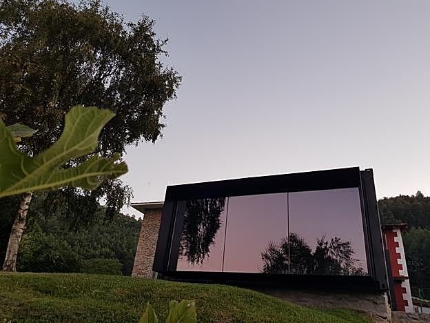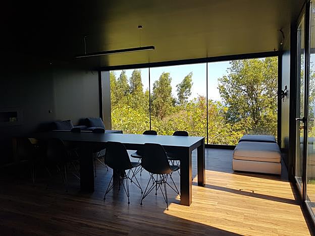 El 'txokontenedor', como así lo han bautizado sus arquitectos, goza de climatización e iluminación indirecta y acogedora, aunque por el día entra luz natural a raudales a través de unos grandes ventanales de techo a suelo de vidrio doble bajo emisivo. Estos cristales presumen de una cara exterior con efecto espejo, para reflejar la naturaleza e integrarlo aún más en el entorno, y de una cara interna que deja disfrutar en modo panorámico de unas privilegiadas vistas al mar Cantábrico. Con razón las visitas «nunca se quieren ir del 'txokontenedor'». Tal y como nos cuentan, cuando llegan invitados es el propietario quien controla la domótica a través del móvil. «Doy las luces, les pongo la calefacción y les doy la contraseña de la puerta». Unas puertas, por cierto, que conservan el candado de seguridad y se han mantenido por aportar un plus de protección.