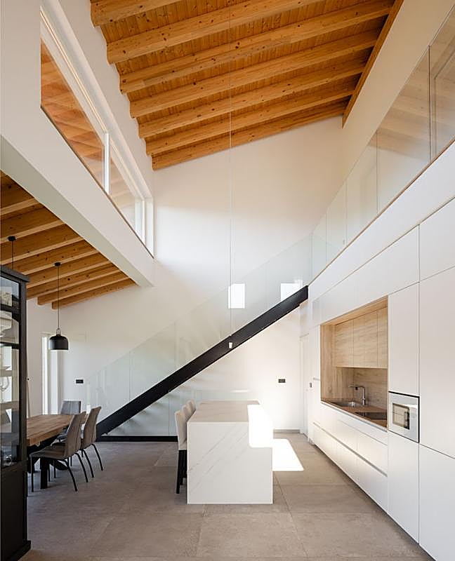 HOBA Studio ha apostado por cubiertas inclinadas y una atractiva fachada simétrica conservando la esencia tradicional en el exterior. Sin embargo, en el interior de la vivienda se respira modernidad en cada rincón. Los tonos grises, blancos y beiges se funden para crear sensación de calidez. «Si utilizamos piezas cerámicas de color grisáceo en tonos fríos, como contrapunto solemos meter colores cálidos a través de la madera, por ejemplo».