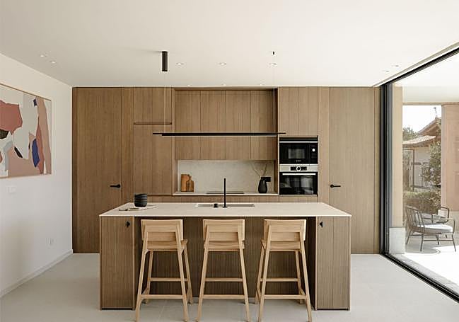 La cocina, de madera de roble tintada, es un diseño de Polo Estudio. Las dos puertas laterales se abren a un lavadero y una pequeña despensa. Rodeando la isla, adquieren protagonismo los taburetes de roble macizo de Nathan Yong para Etnicraft, adquiridos también en Galea Home. «También nos encargamos del interiorismo, es decir, entregamos casas listas para entrar a vivir que siguen una misma línea estética tanto por dentro como por fuera», precisa el arquitecto.