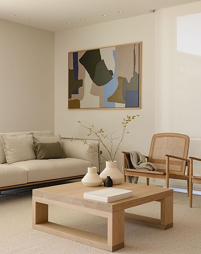 En el salón, los muebles de madera y los tonos neutros aportan calidez a esta estancia. El sofá es un diseño de Mario Ruiz para Joquer, de la tienda de Getxo Galea Home. Y el cuadro del fondo ha sido creado para este proyecto por la firma vizcaína Dok Atelier, capitaneada por Leire Zabala y Haritz Oyaga, que también han realizado otras dos obras para el salón y la cocina. En el comedor, la gran mesa de roble macizo tintado de Rowico Sweden, más oscura, destaca sobre los colores suaves del resto del espacio.