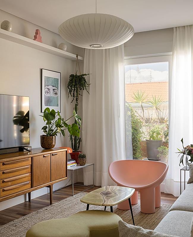 Al mismo tiempo, la reforma pretendía conseguir un equilibrio entre lo moderno y lo 'vintage', para lo que se ha combinado mobiliario de los años 60 y 70 con piezas más actuales. En este sentido, destaca el mobiliario del salón, donde se encuentra un mueble de televisión inglés de teca, una butaca Driade, un espejo italiano de 1970 y una silla Universale de Joe Colombo para Kartell en color rojo. En ese mismo salón, este ático de Indautxu cuenta con una mesa de comedor de los años 80 con base lacada en negro y tapa de mármol de Carrara.