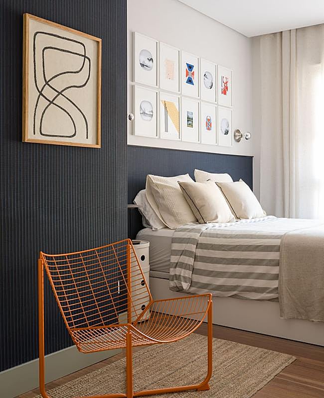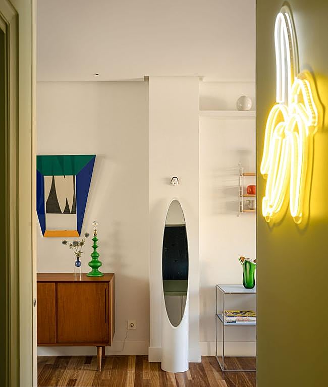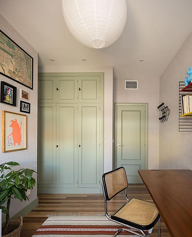 El dormitorio principal, por su parte, adquiere una personalidad propia gracias a una pared en azul Bilbao y apliques Teti de Arttemide. El proyecto también ha mantenido algunos elementos que ya tenía la propia vivienda, como el suelo de madera original, aunque se le ha realizado un tratamiento de aclarado, acuchillado y barnizado.