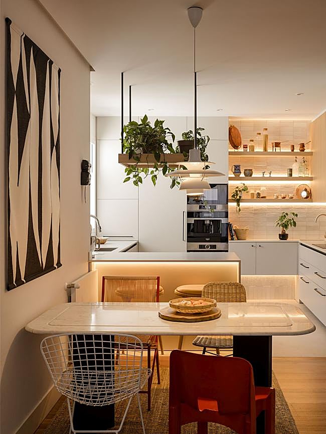 Con la finalidad de conseguir que el estilo de la vivienda fuera además fresco y luminoso, María ha utilizado iluminación indirecta con canales LED y luminarias puntuales para crear ambientes cálidos. Para profundizar en la calidez de este hogar, también «se han incorporado diferentes elementos que aportan color y personalidad, como los muebles de cocina de Arrital en tonos neutros, con acabados en roble y detalles en negro. El color también se extiende a las puertas, en tonos verde pastel, y a los papeles pintados en blanco y azul Bilbao», detalla María.