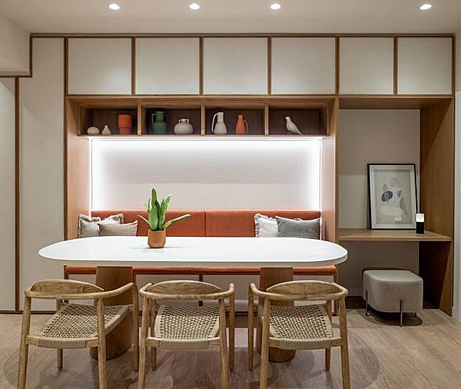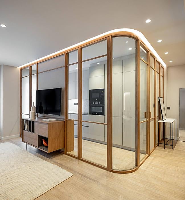 Las diseñadoras también han dividido la vivienda en zonas diurnas y nocturnas. En la zona de día, un llamativo cierre curvo y transparente divide la cocina del salón; permite el contacto visual y, al mismo tiempo, aísla el ruido y los olores. «Los propietarios dieron mucha importancia al almacenaje. La conexión de los espacios comunes es vital». En el lateral, un mueble de lado a lado sirve de almacenamiento, tanto para la zona de entrada como para la del salón, integrando un hueco central con un sofá. «Quisimos hacer un diseño especial integrando la mesa con un mueble que abarca la entrada, el comedor y una zona con un cubito y un 'pouf' con el fin de poder trabajar con el portátil», dicen.